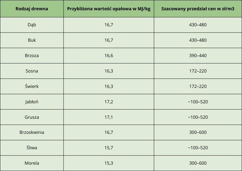 Postanowiłam stworzyć tabelę, aby konkretnie porównać ceny oraz kaloryczność drewna liściastego, iglastego i owocowego. Poszczególne ceny uśredniłam na podstawie raportów branżowych i wielu specjalistycznych serwisów internetowych. Wartości opałowe również zebrałam z różnych badań naukowych i artykułów specjalistycznych. Dane odnoszą się do drewna o poziomie wilgotności ok. 15%.