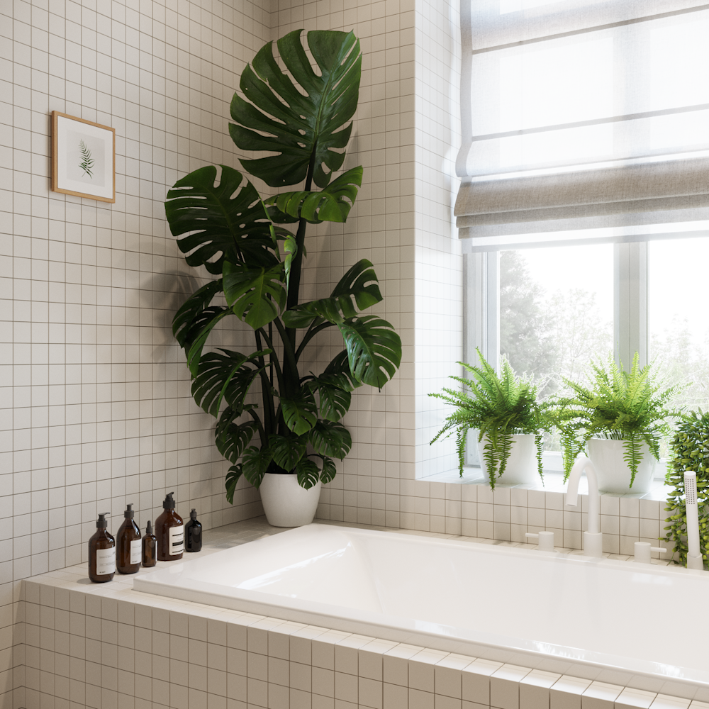 Kolejnym ponadczasowym trendem jest obecność roślin w łazience. Zieleń działa kojąco, oczyszcza powietrze i sprawia, że przestrzeń staje się żywsza. W łazience, gdzie panuje wilgoć i przeważnie jest mniej światła niż w innych pomieszczeniach, świetnie sprawdzają się paprocie. Ich pofalowane liście przełamią surowe geometryczne kształty płytek i wanny, dodadzą więc wnętrzu miękkości. Jeśli mamy więcej miejsca, świetnie sprawdzi się również monstera lub sansewieria.