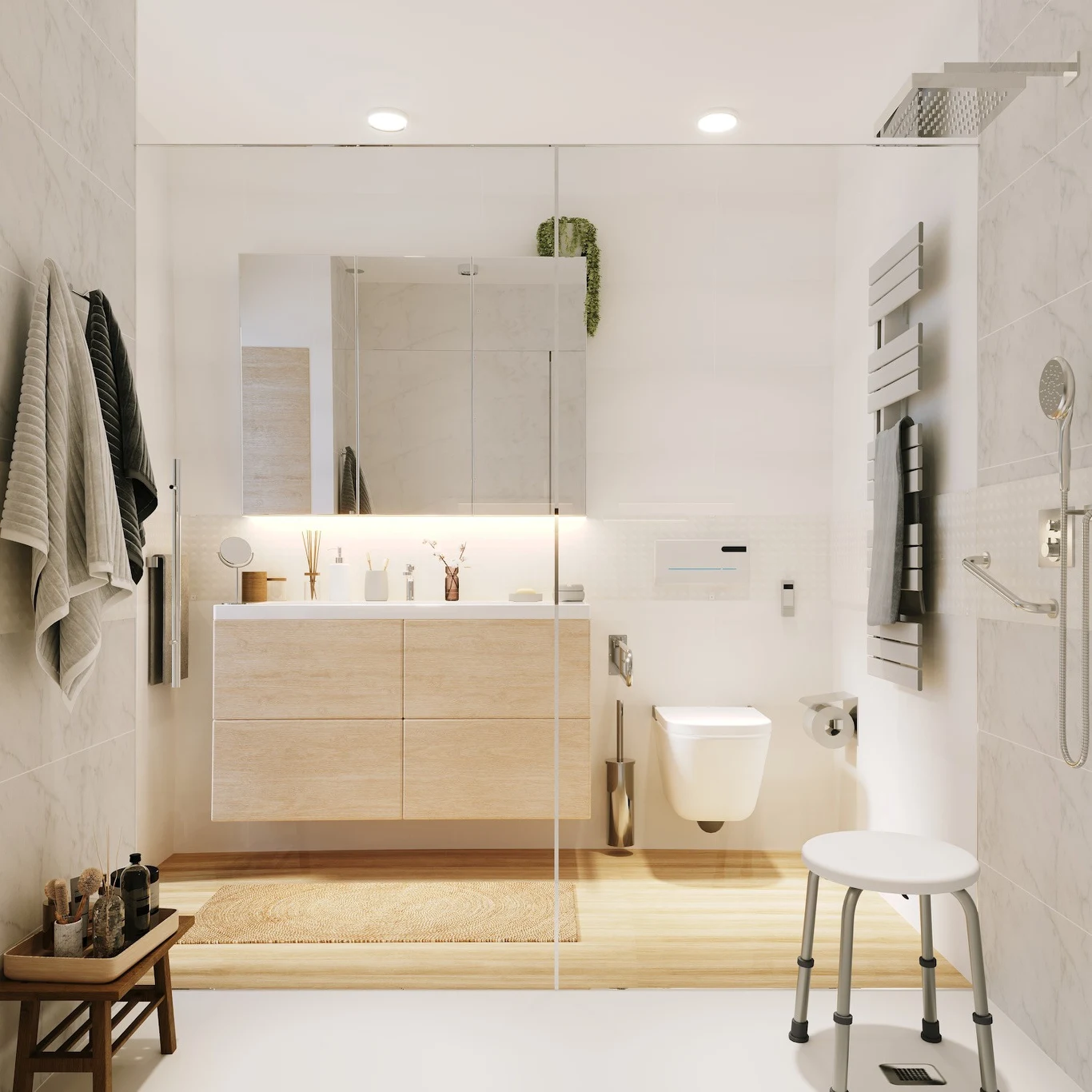 Jednym z najważniejszych elementów każdej łazienki przystosowanej dla osób starszych i z niepełnosprawnościami jest kabina prysznicowa typu walk-in. Jest to prysznic bez brodzika lub z minimalnym progiem, co ułatwia dostęp osobom o ograniczonej sprawności ruchowej, w tym umożliwia wjechanie wózkiem inwalidzkim.