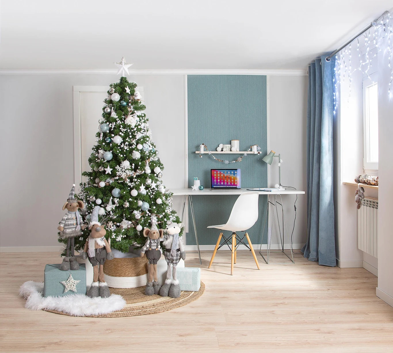 Granatowa choinka to trend, który dopiero zyskuje popularność, ale już podbija świąteczne kampanie marek premium. Granat jest barwą elegancką, głęboką, zmysłową. Idealnie komponuje się ze srebrem i szkłem, choć w wariancie monochromatycznym również zachwyca. W połączeniu z niebieskim światłem lampek Cortina możemy stworzyć efekt subtelnej iluminacji, która wygląda jak odbicie zorzy polarnej. Granatowe drzewko świetnie pasuje do wnętrz glamour, nowoczesnych przestrzeni i salonów, w których chcemy wyczarować świąteczną aurę z nutą tajemnicy.