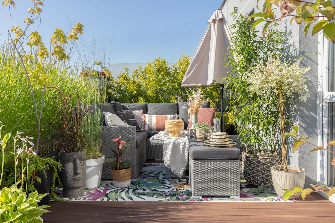 Roślinność jest nieodłącznym elementem tej aranżacji. Postawmy na gatunki, które przypominają dżunglę, a jednocześnie poradzą sobie w naszych warunkach. Bambusy w wysokich donicach ogrodowych stworzą zieloną ścianę i dają poczucie intymności. Paprocie pięknie rozkładają swoje liście, a ich soczysta zieleń kontrastuje z ciemnymi donicami. Wybierzmy też sukulenty i palmy, które dodadzą tropikalnego klimatu aranżacji. Gdy temperatury zaczną spadać, pamiętajmy, by postawić je w domu. Świetnie sprawdzą się również strzeliste trawy. Nie musimy rezygnować z kwiatów, które tak lubimy sadzić na balkonach: pelargonie czy petunie mogą dodać uroku naszej azjatyckiej kompozycji. W półcieniu dobrze czują się także egzotyczne storczyki.