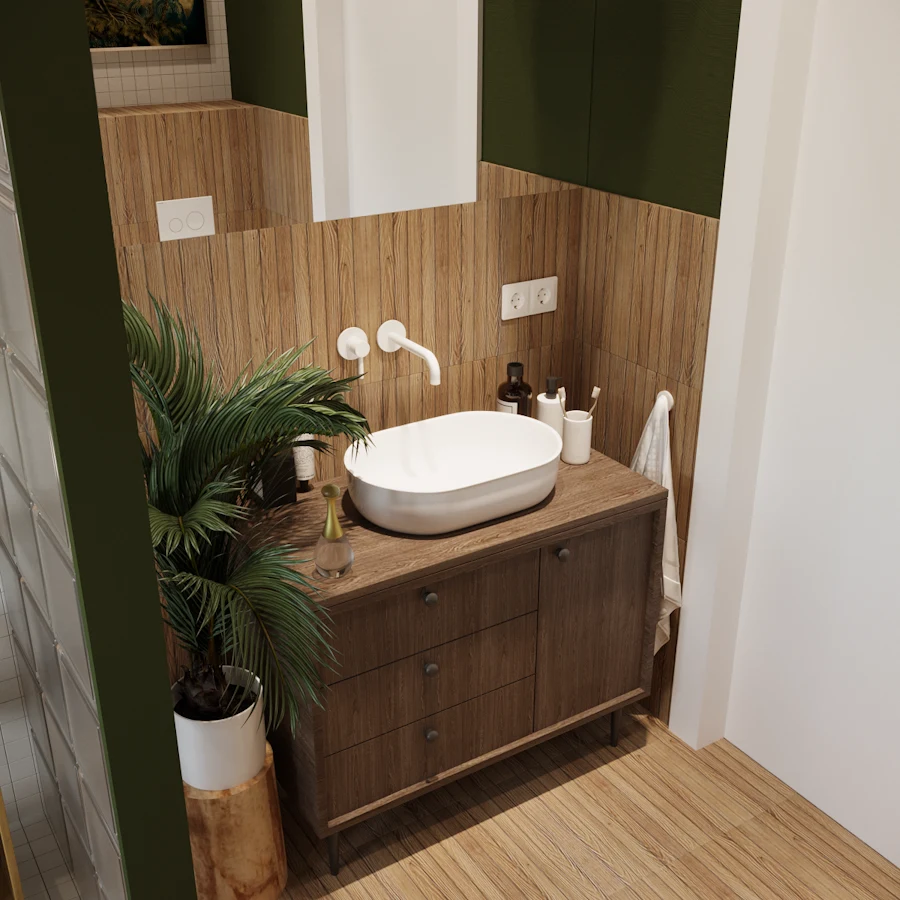 Drewnopodobne kafelki dodają przytulności i są łatwe w utrzymaniu – nie wymagają tylu zabiegów pielęgnacyjnych co naturalne drewno. Zamiast szafek z połyskiem, wybieramy matowe wykończenia i bambusowe regały, które sprawiają, że nawet bardzo nowoczesna łazienka zyskuje miękkość i spokój. W połączeniu z dodatkami z rattanu czy lnianą roletą rzymską całość staje się spójna, przyjazna, po prostu domowa.