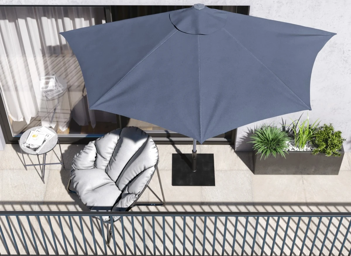Prostym i skutecznym sposobem na ochronę przed słońcem jest zamontowanie parasola balkonowego. Zaletą tego rozwiązania jest fakt, że nie wymaga inwazyjnego montażu do ściany i jest mobilny – z łatwością zmienimy kierunek, w którym chcemy uzyskać cień. Jest to szczególnie ułatwione w modelach z ruchomą czaszą i zmiennym kątem jej nachylenia. Wybierając parasol, należy uwzględnić wielkość przestrzeni, którą chcemy zacienić. Dla wąskich balkonów idealne są modele półokrągłe, które można przystawić do ściany, optymalizując wykorzystanie przestrzeni. Na większych tarasach można użyć większych parasoli na asymetrycznej sztycy i z regulowaną czaszą, które nie przeszkadzają w korzystaniu z mebli ogrodowych i dają możliwość przesuwania cienia wraz ze zmianą kąta nasłonecznienia w ciągu dnia.