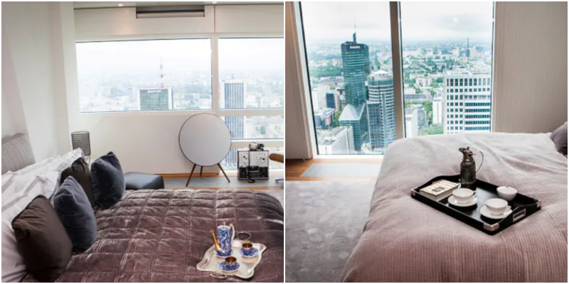 Z łóżka w sypialni Lewandowskich rozciąga się zapierający dech widok na panoramę Warszawy.
