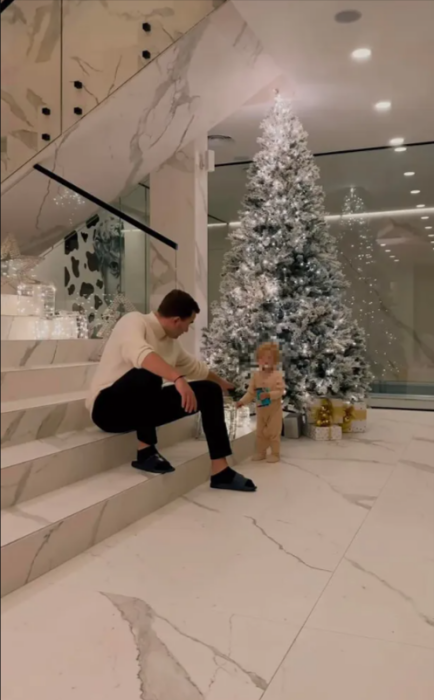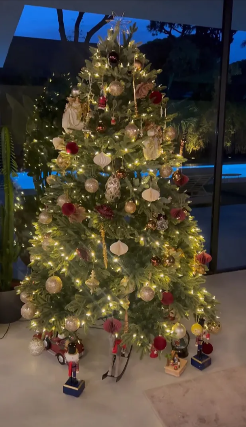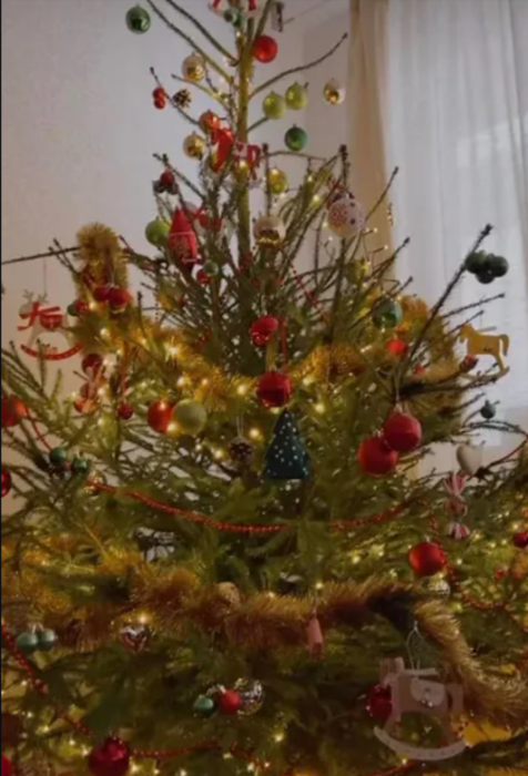 Drzewko ubrane jest w klasyczny, skromny sposób — króluje złoto i czerwień. Pod drzewkiem możemy zobaczyć drewniane figurki, m.in. konia na biegunach i dziadka do orzechów. Niecodziennym widokiem jest basen, który majaczy tuż za oknem.