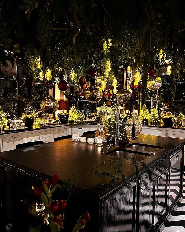 Kuchnia Joanny w podwarszawskiej willi również zyskała świątecznego klimatu. Nad czarną wyspą kuchenną zawisły gałązki drzewka iglastego. To nie koniec! Przy suficie zostały zamontowane również bombki i żarówki.