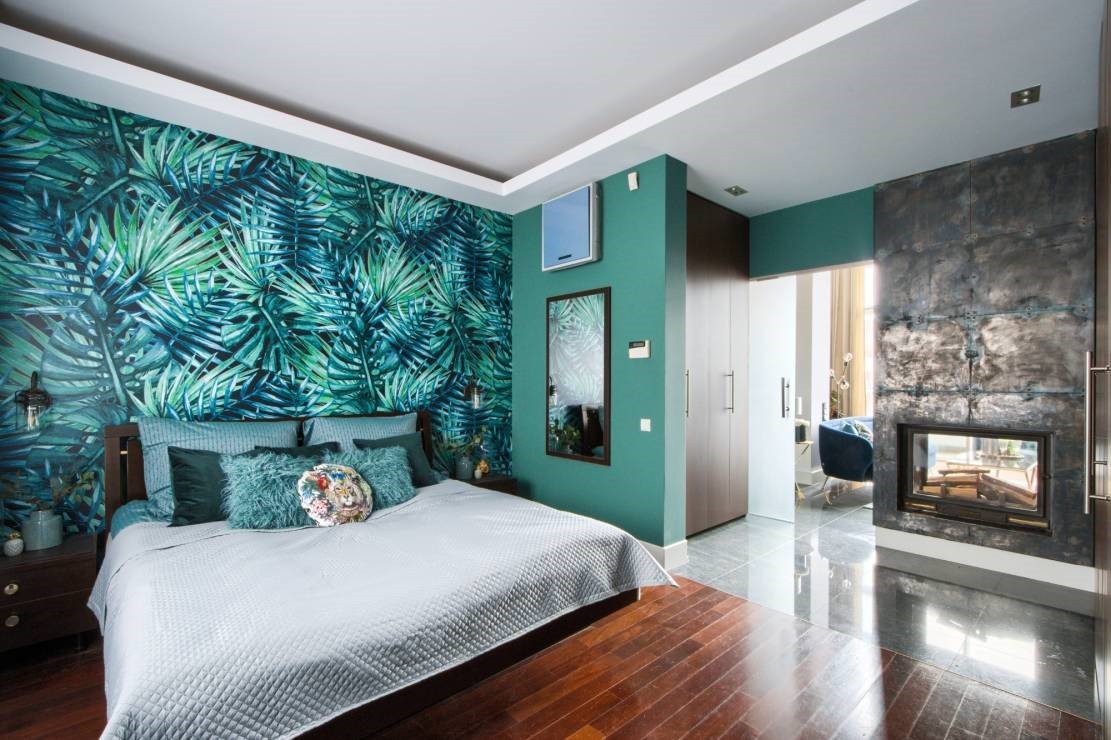 Te same roślinne motywy znajdują na tapetach w sypialni artystki. Wrażenie w tym pomieszczeniu potęgują zielone ściany, pościel i dekoracyjna poducha z tygrysem oraz łazienka utrzymana w podobnym klimacie.