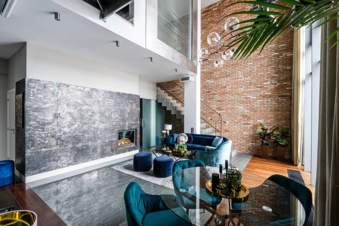Głównym pomieszczeniem jest oczywiście salon wyposażony w welurowe kanapy i pufy w modnym kolorze indygo, nie zabrakło również klimatycznego kominka.