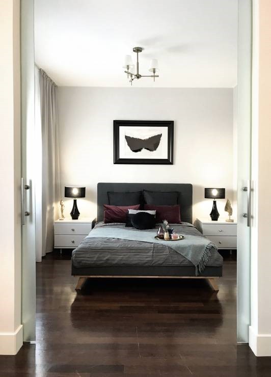 W apartamencie znajduje się również druga sypialnia, tym razem utrzymana w konwencji glamour – czarne, bordowe i złote akcenty na tle jasnoszarych ścian.