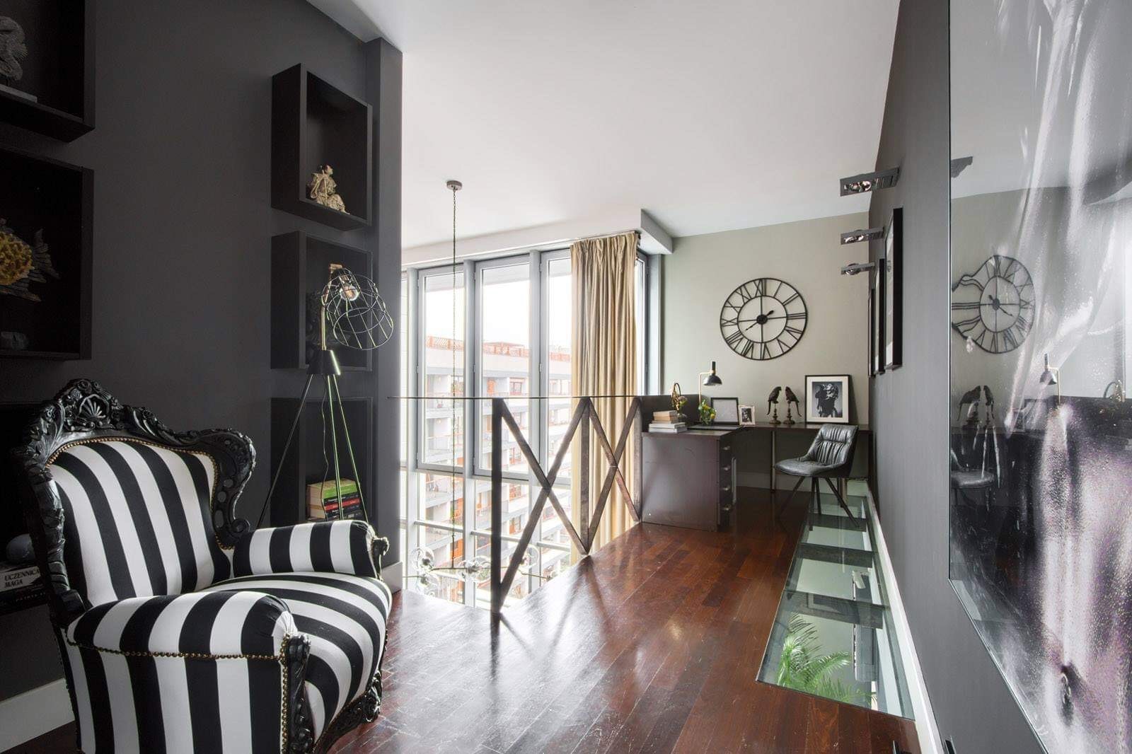 Mocno zaakcentowana jest również ściana wyłożona cegłą, nawiązując tym samym do nowojorskich loftów oraz kamienna podłoga. Parkiet wykonany został z egzotycznego drewna. Dopływ światła zapewnia gigantyczne okno ze szprosami. A całość idealnie dopełniają duże okazy palm.