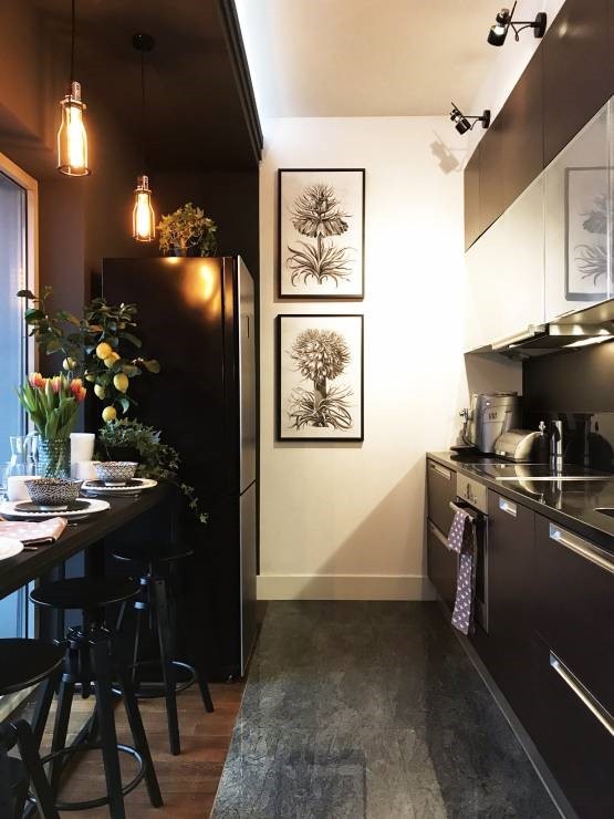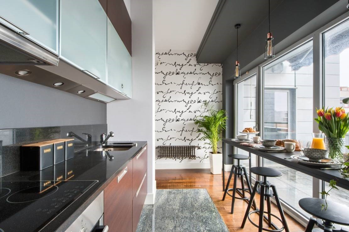 W kuchni dominują ciemne barwy, a wzdłuż dużego okna usytuowany jest stół barowy z widokiem na osiedle.