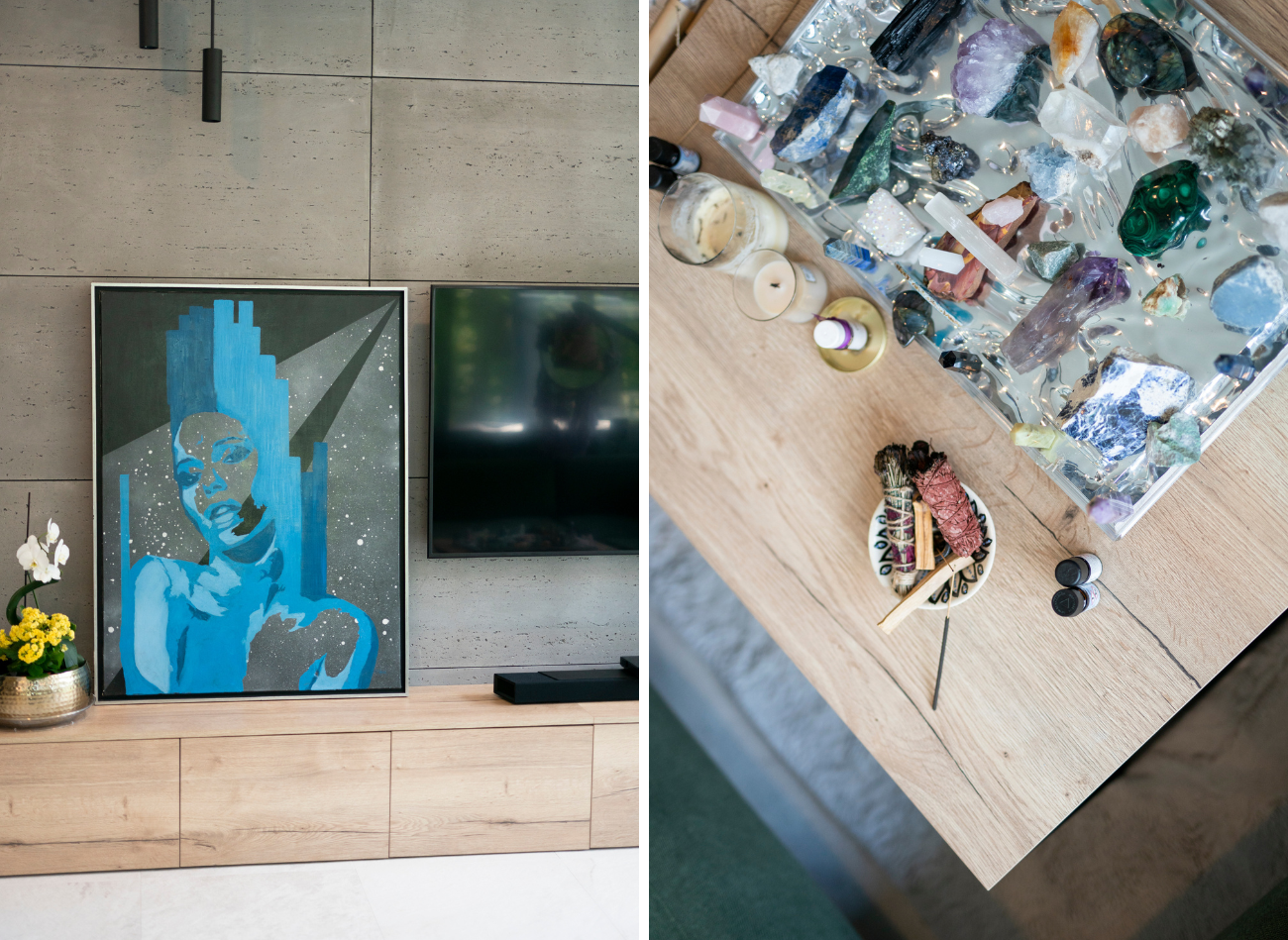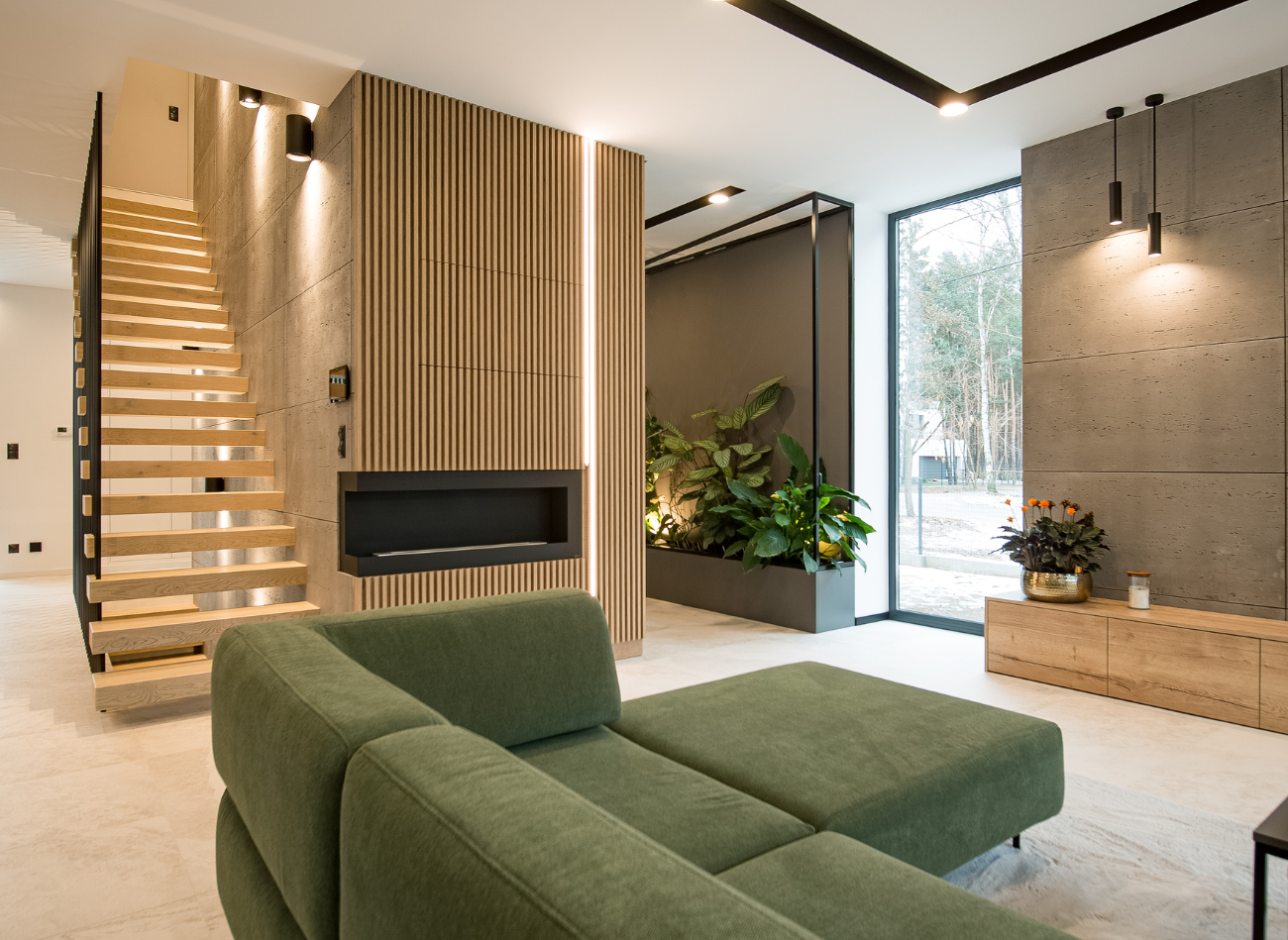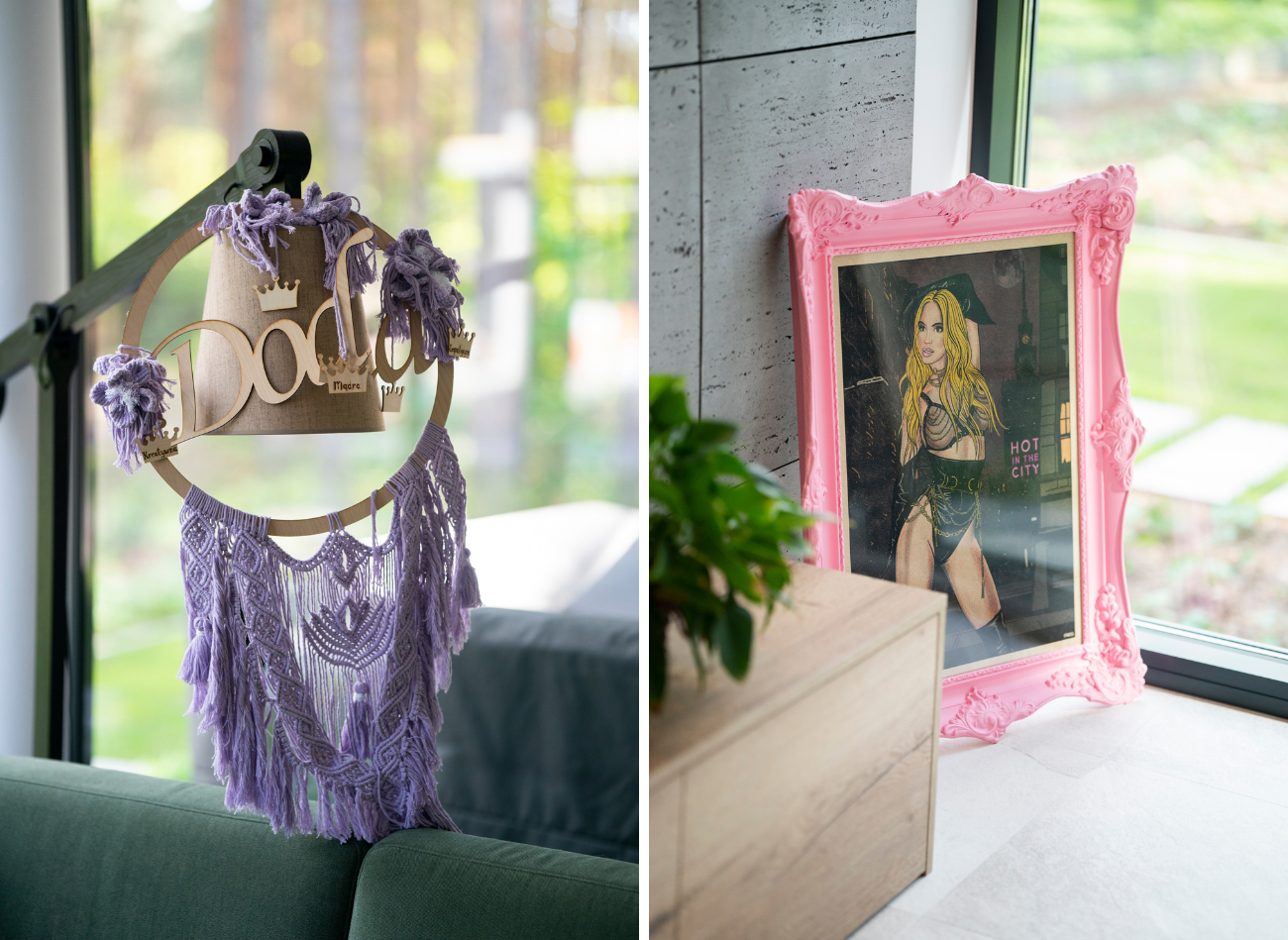 Wnętrza domu, w którym zamieszkała Doda utrzymane są w naturalnej kolorystyce. W aranżacji willi wykorzystano wysokiej klasy materiały wykończeniowe oraz designerskie meble. Znajdująca się w salonie oliwkowa kanapa doskonale współgra z drewnianymi lamelami oraz betonem architektonicznym wyłożonym na ścianach.