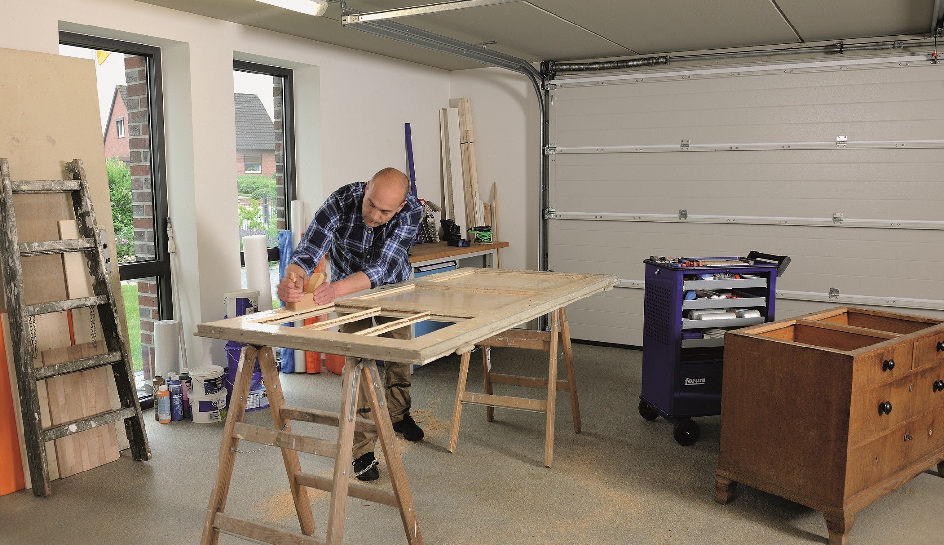 Garaż, w którym urządzono miejsce do ćwiczeń czy majsterkowania powinien być wyposażony w nowoczesny, inteligentny napęd. Najnowszej, czwartej, generacji napędy firmy Hörmann – ProMatic 4, jak i SupraMatic E4 i P4 – są nie tylko szybkie, ale – dzięki zaawansowanej inteligentnej technologii – mogą być obsługiwane za pomocą smartfona z funkcją Bluetooth lub systemów Smart Home.
