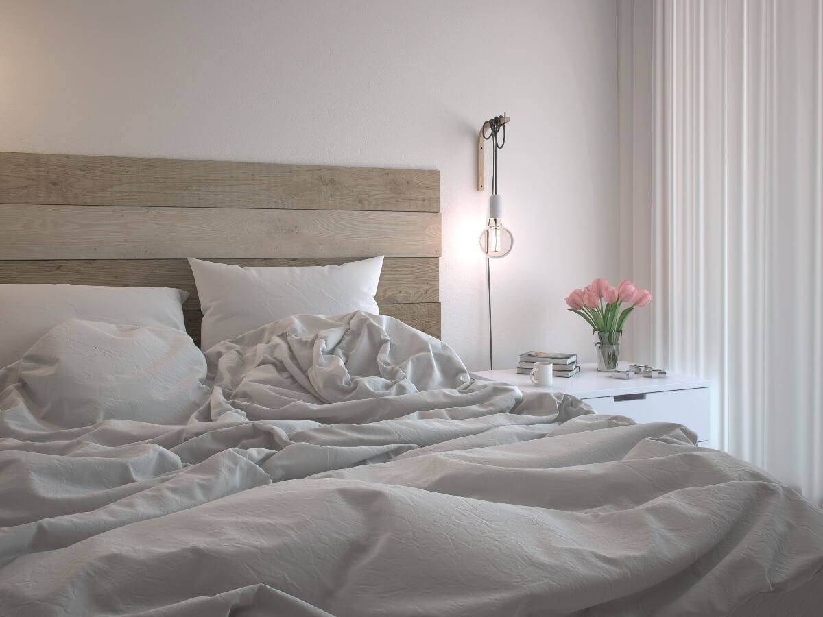 Jedną z największych zalet aranżacji utrzymanych w dyskretnych tonacjach jest to, że stanowią idealną bazę dla rozmaitych zabiegów wnętrzarskich. Pomieszczenie praktycznie w całości skąpane w czystej bieli i jasnych kolorach drewna nie tylko wyda się bardziej doświetlone i przestronne, ale będzie też uwodzić elegancką delikatnością. Łagodny nastrój w sypialni podkreśli subtelny akcent w postaci pastelowych kwiatów.