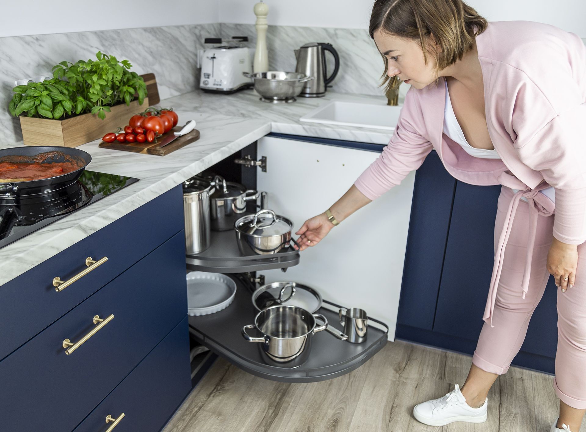 Nie wiesz jak ergonomicznie zagospodarować kuchenny narożnik? Pomyśl o szafce LeMans. To system, który powstał właśnie z myślą o zagospodarowaniu trudno dostępnych miejsc w narożniku kuchni. O ile w Tandemie przechowasz zapasy produktów suchych, a w systemie Snello przyprawy – o tyle LeMans to najlepsze miejsce na garnki, patelnie i brytfanny. Dlaczego? Ponieważ jego półki są owalne, a każda z nich wyjeżdża z lekkością do przodu. Jednym ruchem ręki możesz wyciągnąć całą zawartość na zewnątrz i sięgnąć po dowolny garnek.