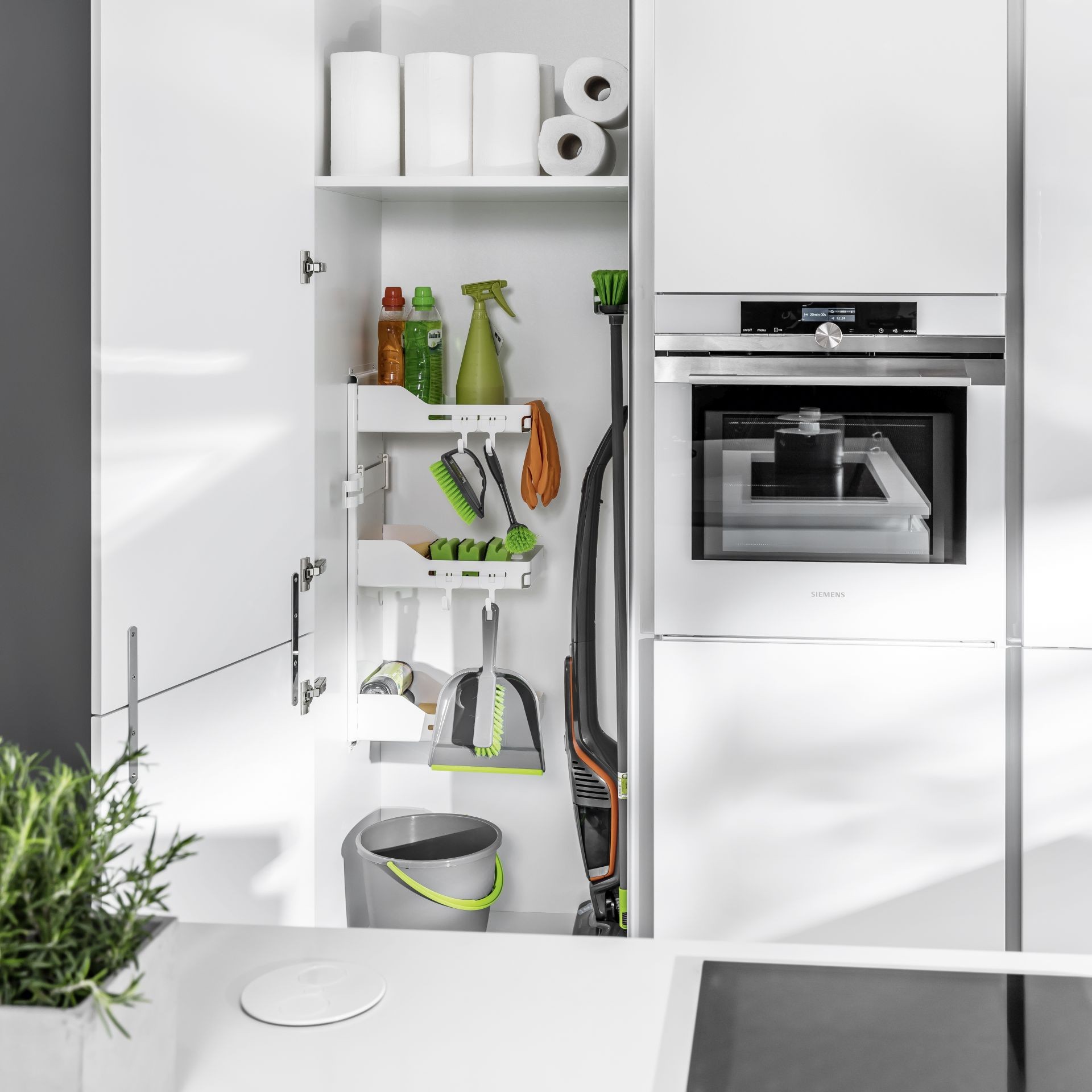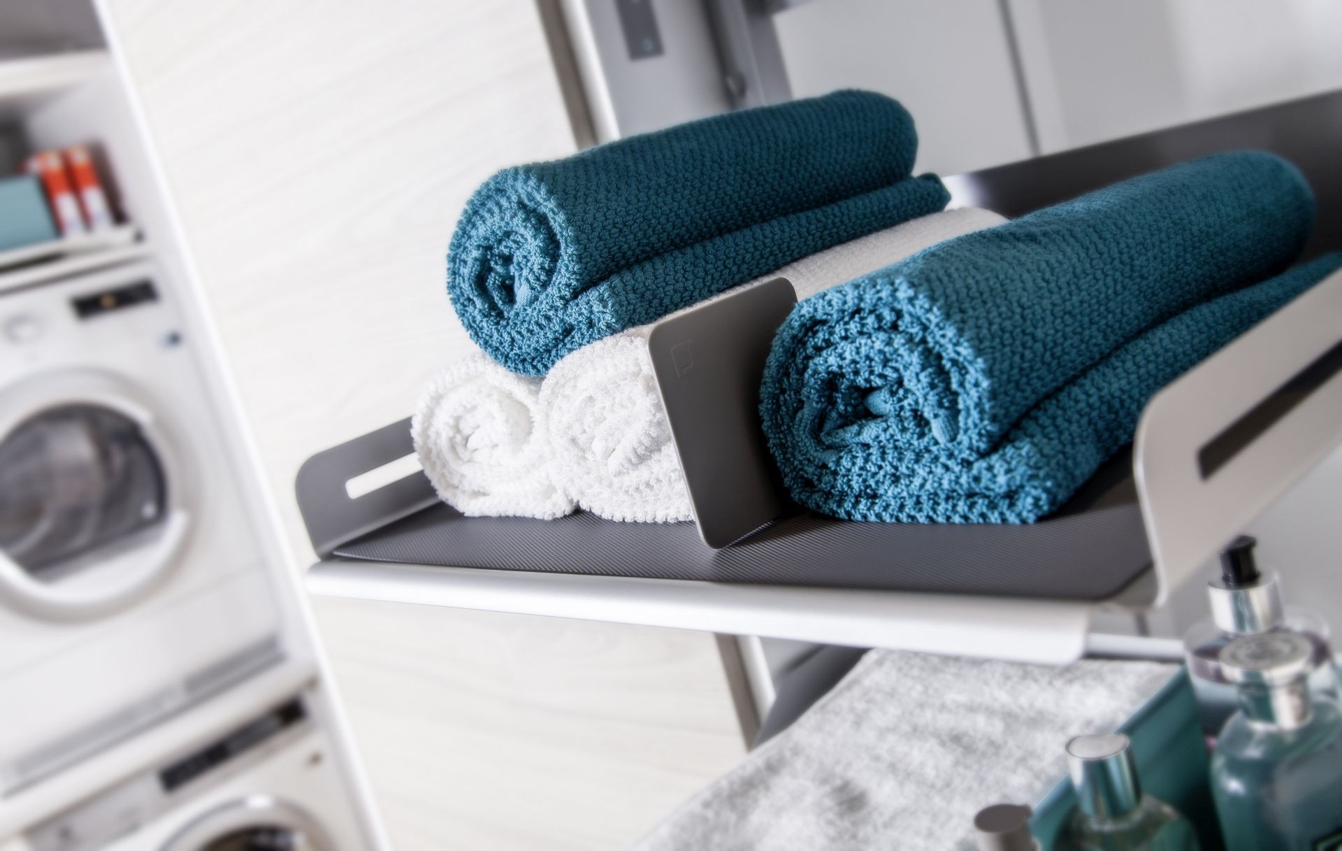 W dużych łazienkach, połączonych z pralnią świetnie sprawdzi się półka Extendo zamontowana nad pralką. Dzięki temu, że łatwo się ją wysuwa, sięgnięcie po płyn czy proszek do prania nie będzie już problemem. W większych łazienkach, do przechowywania ręczników, pościeli, bielizny domowej czy środków czystości możemy wykorzystać wysokie systemy Le Mans czy Convoy Lavido. Organizer ułatwiający przechowywanie kosmetyków i drobiazgów to z kolei idealny pomysł do szafki podumywalkowej. Natomiast w organizacji szafek gospodarczych pomocne będą dedykowane rozwiązania, takie jak np. Sesam – system do przechowywania przyborów: odkurzacza, szczotek, gąbek czy wiadra. Specjalne wieszaki na szufelki, szczotki do sprzątania czy miotłę to więcej porządku w akcesoriach sprzątających.