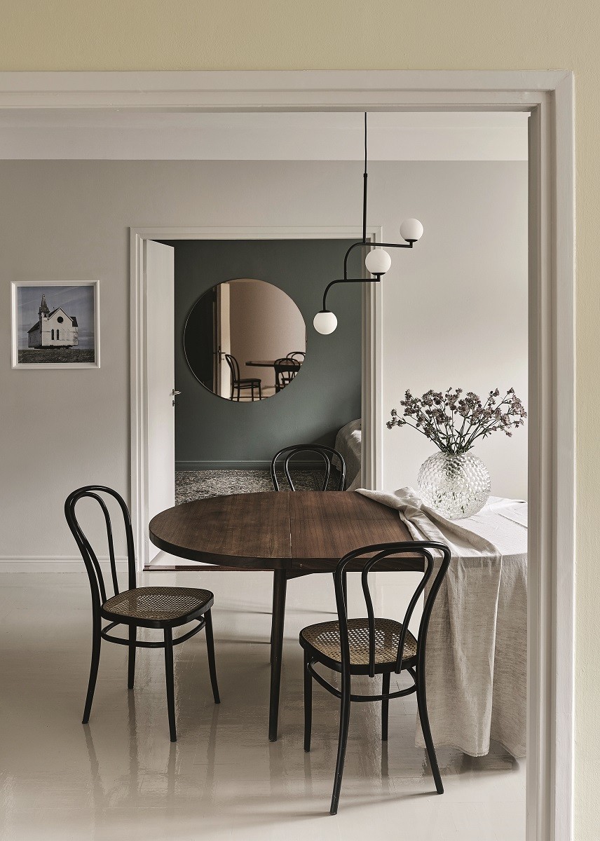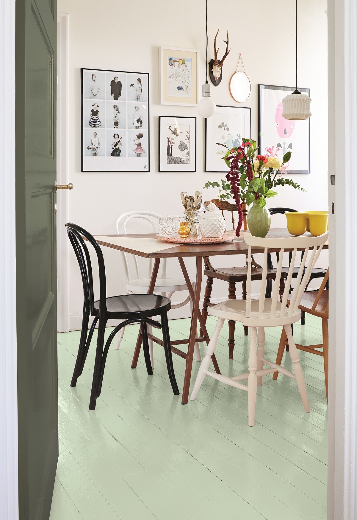 Osoby lubiące niestandardowe triki w aranżacji wnętrz mogą pokusić się o zawieszenie w obu sąsiadujących pokojach – przeciwlegle do siebie – widocznych przez drzwi luster. Zwielokrotnią one wrażenie przestrzeni i zapewnią nietuzinkową ozdobę, zwłaszcza gdy w lustrach w różnych stylach odbiją się dwa piękne kolory ścian: Y487 oraz K444 z palety Tikkurila Symphony. Ciekawym pomysłem będzie też wykorzystanie niezwykłych efektów kolorystycznych. Z pewnością całkowitym zaskoczeniem aranżacyjnym będzie kryjąca się za drzwiami miętowa podłoga jadalni, którą możemy uzyskać dzięki farbie Tikkurila Betolux Aqua w kolorze X375. Jeśli w takim pomieszczeniu zestawimy różnorodne krzesła, zyskamy unikatowe i zachwycające wnętrze w stylu Eclectic. A przy okazji nasza stara podłoga zyska nowe życie w zgodnie z ideą „less waste”.