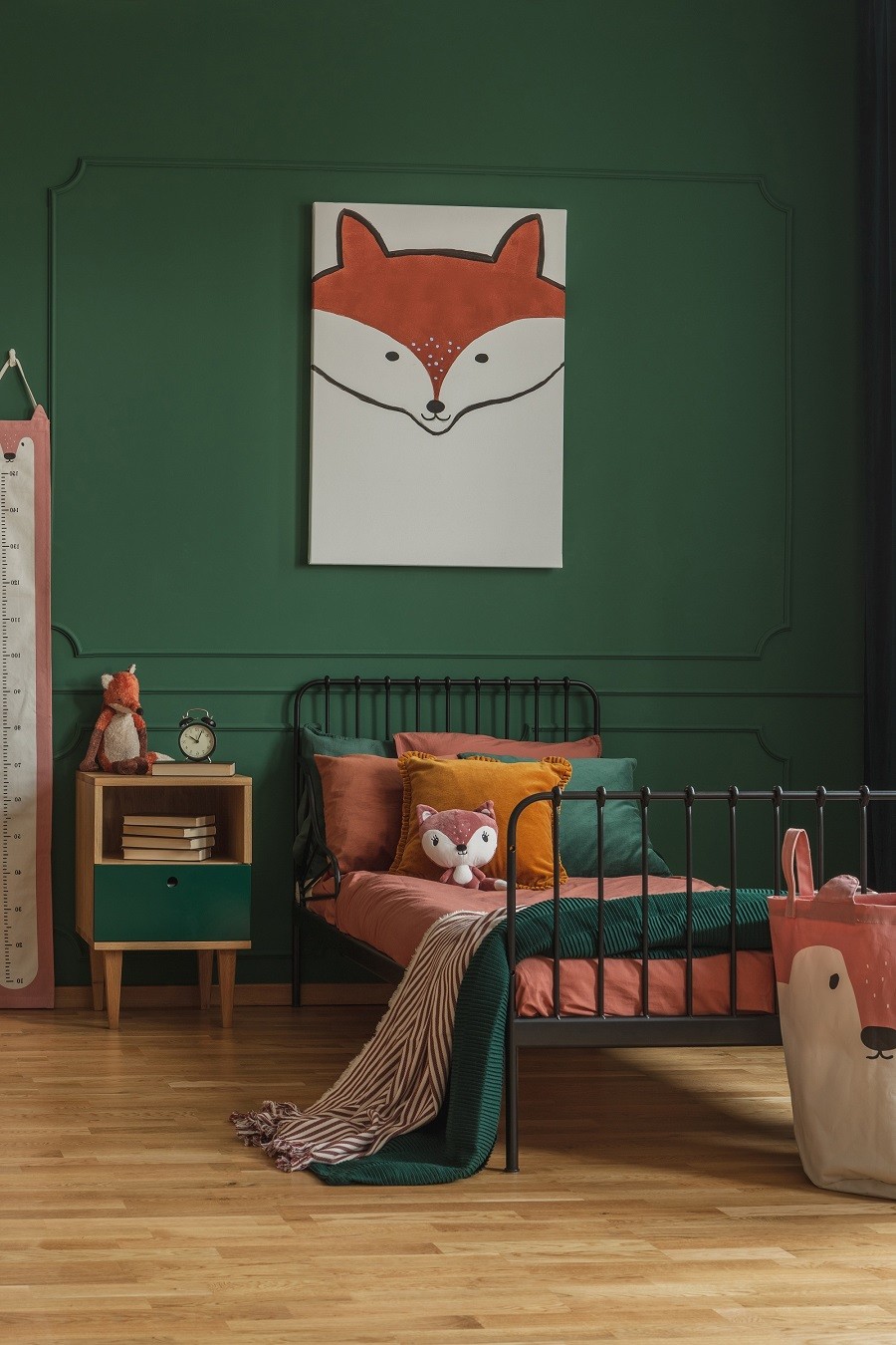 A może pokój w stylu zaczarowanego leśnego królestwa? Jeśli nasza pociecha lubi przyrodę, możemy śmiało zaprojektować przestrzeń nieco tajemniczą i stymulującą zmysły. W takim pomieszczeniu w roli tła doskonale sprawdzi się głęboki odcień butelkowej zieleni M368, który sprawi, że nasze dziecko poczuje się jak podczas rodzinnego wypadu do lasu. Nawiązujące do tematu dodatki z motywem lisa, jak np. kosz na zabawki czy przytulanka służąca za poduszkę to pomysł na połączenie funkcjonalnych elementów dziecięcego pokoju z poprawiającą samopoczucie stylistyką.