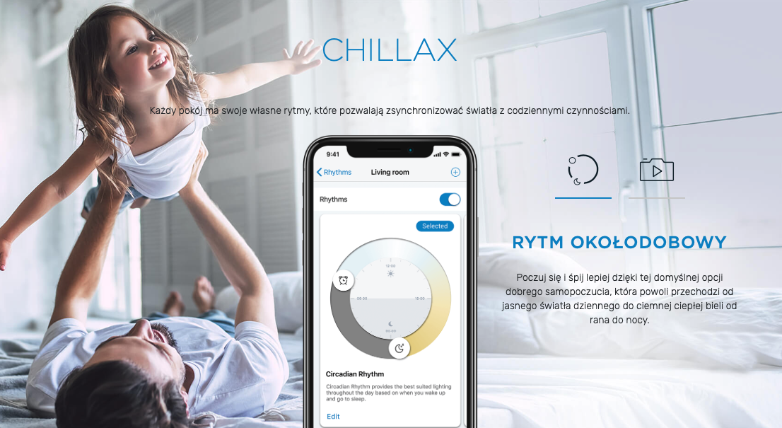 Ustawienia rytmu dobowego automatycznie dobierają odpowiedni rodzaj światła w zależności od pory dnia. Chłodne, jaskrawe, pobudzające światło idealne podczas wypełnionych zajęciami poranków stopniowo przechodzi w subtelne, ciepłe, przyćmione światło doskonałe do wieczornego relaksu. W ten sposób oświetlenie naśladuje dobowy cykl słoneczny wewnątrz pomieszczeń.