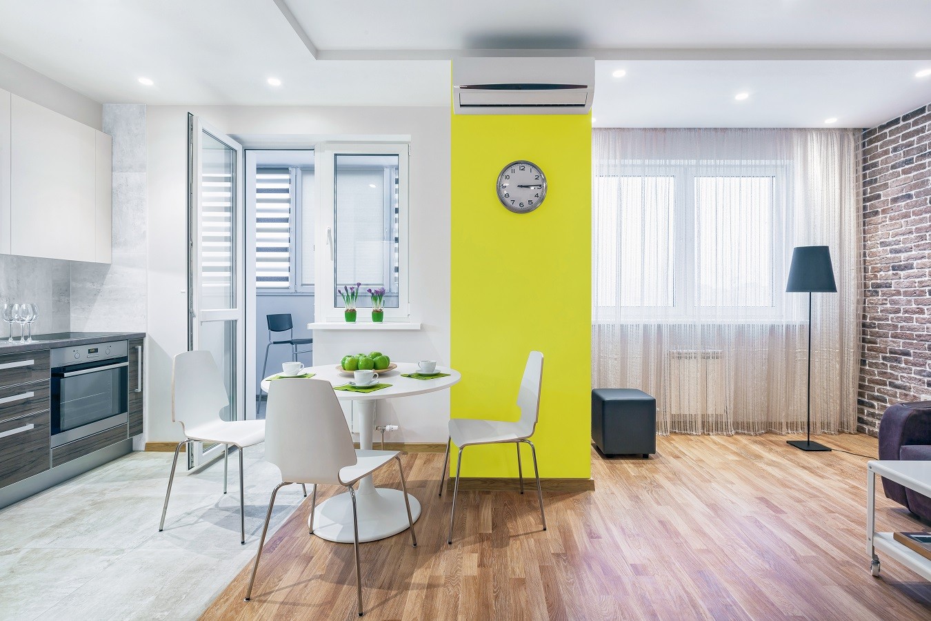Czy jadalnia może wprawiać w pogodny nastrój i dodawać energii? Jak najbardziej! Wystarczy postawić na harmonijne zestawienie jasnej barwy z pobudzającym kolorem Zielona moc. Pomalowanie frontu ściany działowej tym soczystym odcieniem, to prosty sposób na zaakcentowanie trójwymiarowości pomieszczenia i oddzielenia kuchni i strefy odpoczynku. Naturalna cegła na ścianie dodatkowo zaznaczy nowoczesny i loftowy wystrój pomieszczenia. Naturalne dekoracje w kuchni w postaci zielonych roślin wprowadzą ożywczą aurę, która pobudzi i pozytywnie nastroi nie tylko o poranku.