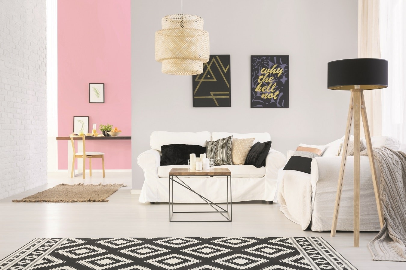 Salon powinien stanowić oazę relaksu i służyć do odpoczynku po długim dniu. Nie oznacza to jednak, że nie może zaskakiwać. Wręcz przeciwnie – kojący, ale wyrazisty element kolorystyczny doda pomieszczeniu szyku i umili spędzony w nim czas. Barwa Szare wytchnienie z palety Jedynka Deco & Protect Zmywalna świetnie sprawdzi się w eleganckim wnętrzu, stanowiąc dobre tło dla dodatków, takich jak oryginalna lampa na drewnianych nogach czy czarno-złote grafiki. Widoczny fragment drugiego pokoju w pastelowej odcieniu Różana idylla ożywi monochromatyczną stylizację, wydzielając tym samym beztroski i pełen wdzięku kącik jadalniany.