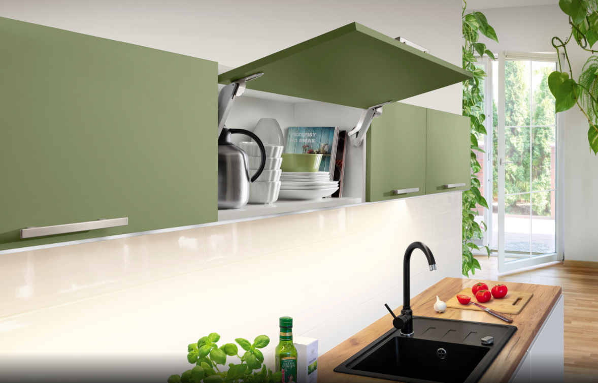Niewielka kuchnia to również miejsce, gdzie wiele dodatkowej pojemności możemy uzyskać dzięki dużym szafkom wiszącym. Warto sprawdzić w salonie, jaki sposób otwierania i zamykania takich szafek odpowiada nie tylko naszemu gustowi, ale też wzrostowi. Ergonomiczną obsługę zapewnią zawiasy do otwierania w górę dwuczęściowych klap, a więc tych, które niejako z definicji są wysokie. Duże klapy wcale nie muszą się jednak składać na pół. Ciekawą ofertą jest tutaj Free Space. To bardzo łatwy w montażu nieduży podnośnik, który utrzyma w górze front o masie blisko 11 kilogramów.