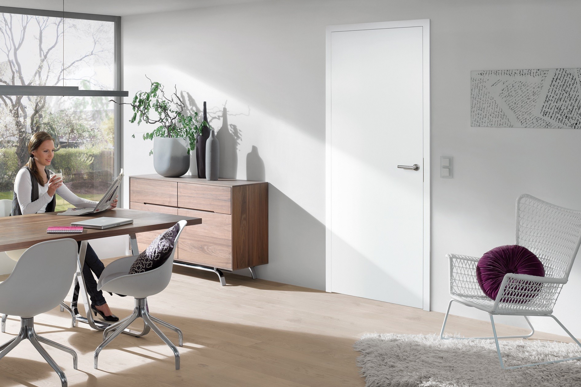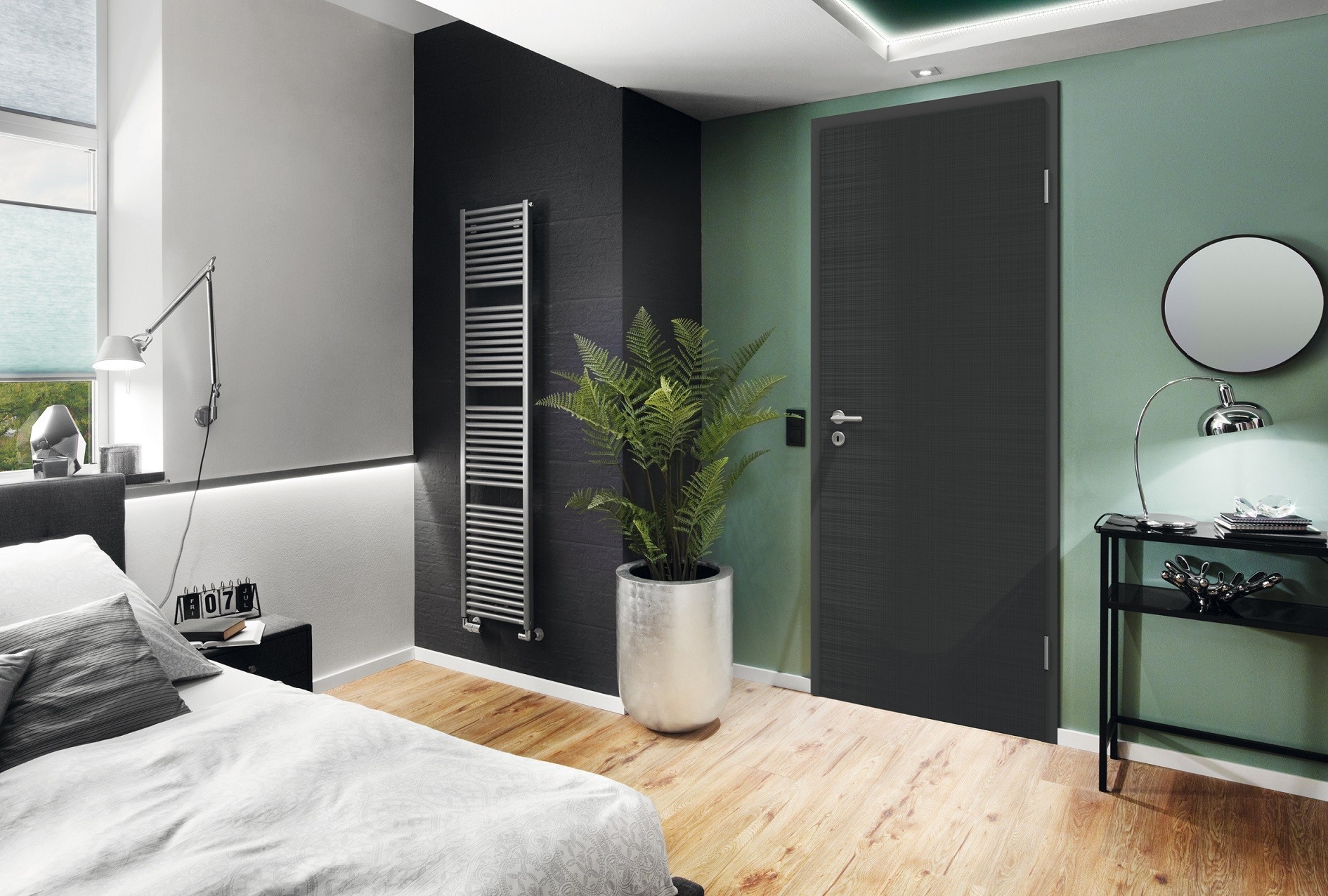 Znaczenie dla odbioru aranżacji wnętrza ma również kolorystyka drzwi. Kolor powinniśmy dopasować do całości wnętrza, a nie tylko do jednego z elementów – na przykład podłogi. Dużo ciekawszy efekt uzyskamy, dobierając je na zasadzie kontrastu. Ostatnimi czasy największą popularnością cieszą się drzwi w kolorze białym, które pięknie komponują się zarówno z rustykalną, bieloną podłogą, jak i szarym gresem kojarzącym się z industrialnym stylem. Dobrze będą wyglądać także w domach, w których wystroju dominuje drewno. Optycznie powiększają i rozświetlają przestrzeń, co jest ogromną zaletą w przypadku małometrażowych mieszkań w bloku. Dodatkowo na podłodze możemy zastosować wówczas, bez żadnej obawy, najbardziej śmiałe wzory. Nie bez znaczenia jest ponadto dobór akcesoriów, np. klamek. – Ciekawie prezentuje się zastosowanie klamek w wariancie Planar firmy Hörmann, czyli zagłębiona w skrzydle drzwiowym rozeta klamki, która tworzy idealnie równą płaszczyznę – dodaje Krzysztof Horała. Dla naszej wygody możemy wyposażyć drzwi w napęd PortaMatic. Napęd firmy Hörmann do drzwi wewnętrznych umożliwia ich automatyczne otwieranie i zamykanie za pomocą nadajnika, sterownika lub przez aplikacje na smartfonie. Liczne funkcje i możliwości ustawień sprawiają, że napęd ma wyjątkowo uniwersalne zastosowanie i gwarantuje inteligentne mieszkanie bez barier architektonicznych.