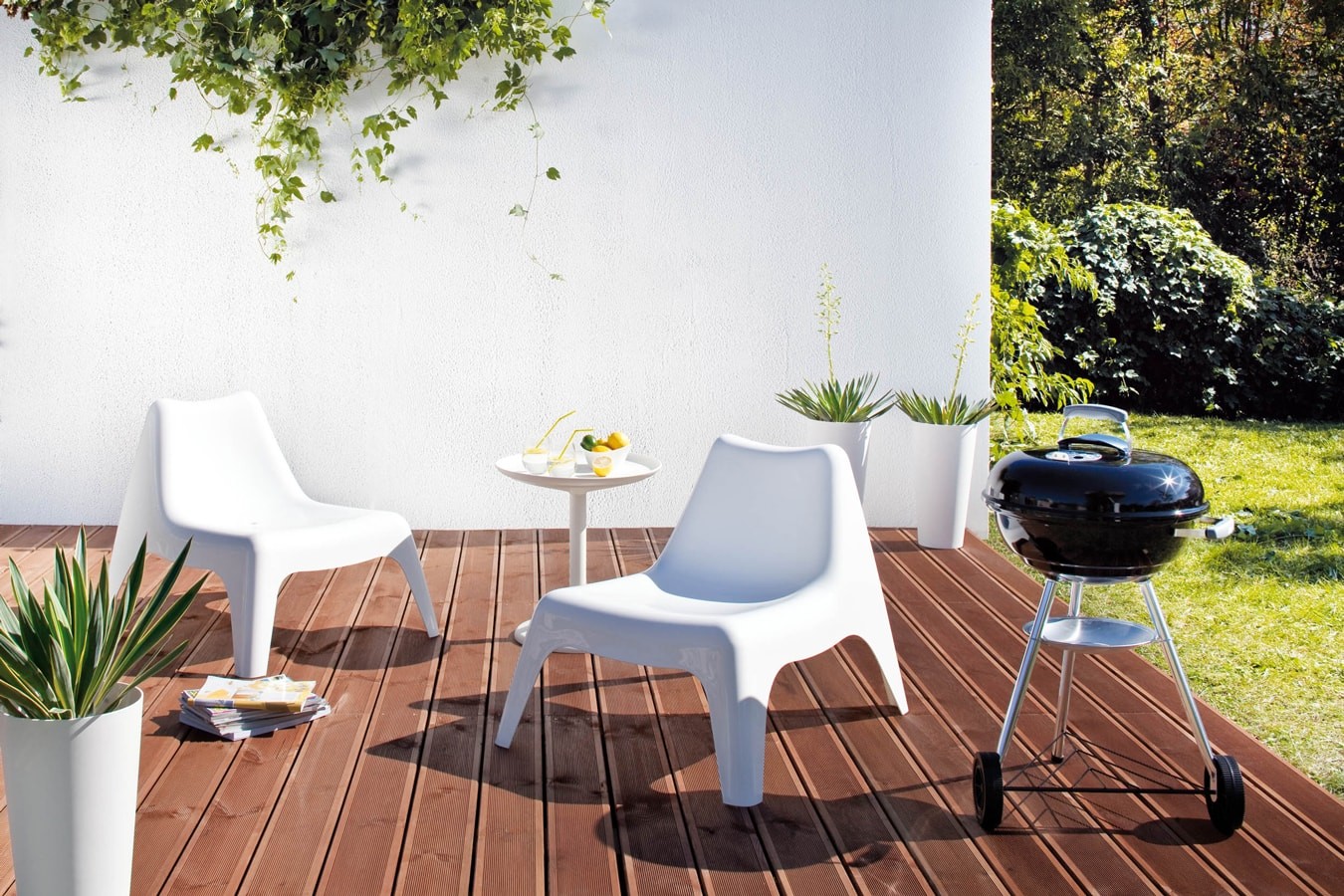 Regularnej pielęgnacji wymagają nie tylko meble, ale i sam taras. Optymalnym wyborem do tego typu powierzchni jest olej, który nie tylko zabezpiecza drewno, ale też pięknie podkreśla jego strukturę, dając bardzo naturalne i przyjemne w dotyku wykończenie. Wodorozcieńczalny olej Tikkurila Valtti Wood Oil Akva głęboko wnika w surowiec, doskonale chroniąc go przed wilgocią i zabrudzeniami oraz ograniczając jego pękanie. Zakonserwowane nim powierzchnie zyskują także wysoką odporność na szkodliwe działanie czynników atmosferycznych. Produkt jest dostępny w bogatej palecie 55 kolorów, bez problemu można więc dobrać idealny odcień, który będzie pasować do ogrodowej aranżacji.