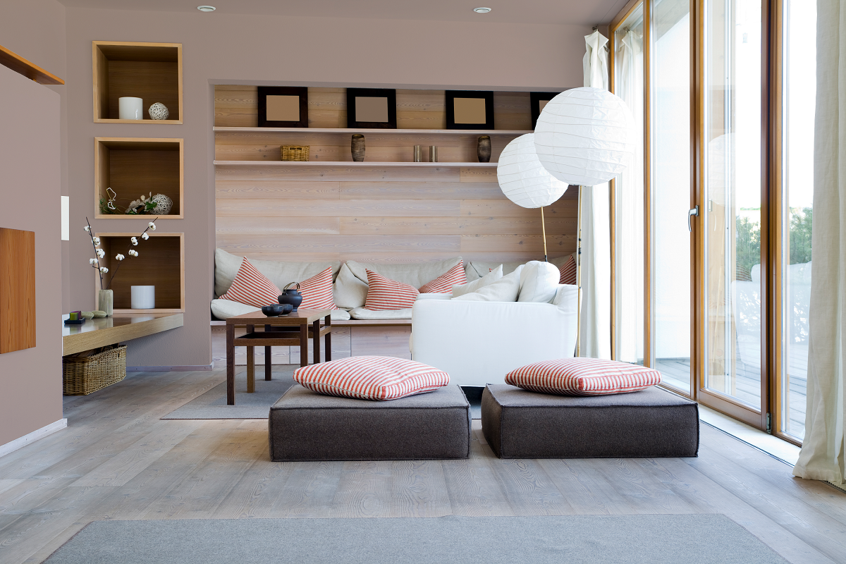 Błogą bazę dla relaksującego czasu w salonie w mroźne dni będzie stanowił subtelny kolor ścian mlecznego odcienia Cup Of Coffee z palety Beckers Designer Colour. Drewniane elementy dekoracyjne oraz brązowe pufy i poduszki w czerwone pasy wprowadzą do wnętrza dodatkową energię, która stworzy skuteczną przeciwwagę zarówno dla białej aury za oknem, jak i dużych, papierowych żyrandoli, przywodzących na myśl śniegowe kule.