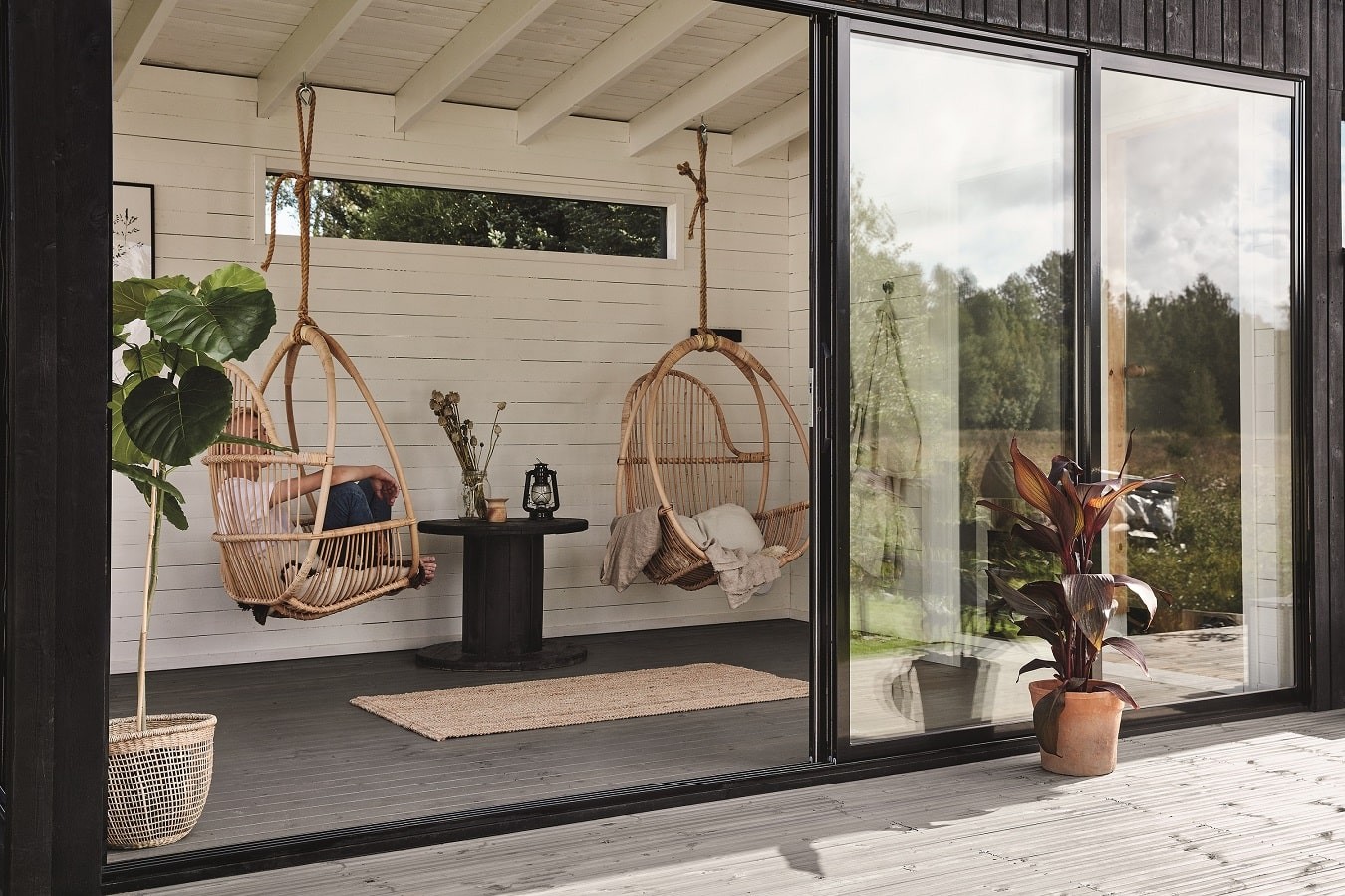 Modne obecne, ciemniejsze tonacje drewna nadają tarasowej aranżacji szlachetności i elegancji. Panele ścienne pokryte Tikkurila Valtti Plus Complete w ciemnoszarym kolorze 5154 w ciekawy sposób można skontrastować z jasnymi deskami tarasowymi.