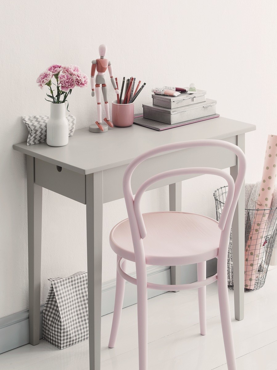 W małych przestrzeniach w roli romantycznej toaletki może wystąpić także niewielki stolik, pełniący różne funkcje w domu. Urokliwe połączenie kobiecości ze współczesną elegancją uzyskamy poprzez pomalowanie stojącego przy nim klasycznego drewnianego krzesła emalią Tikkurila Everal Aqua Semi Matt 40 we wdzięcznym odcieniu pastelowego różu F479, który gustownie skomponuje się z powściągliwą szarością stolika w odcieniu 1964.
