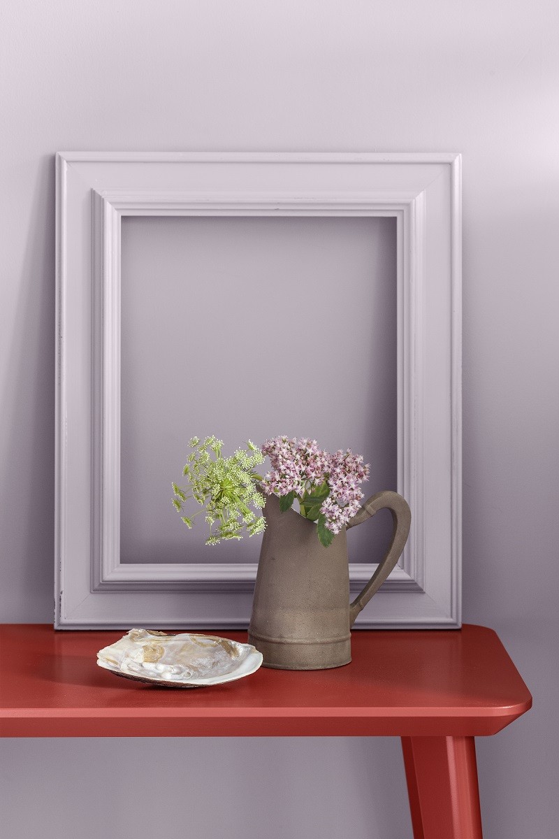Niezwykle kuszące w aranżowaniu kobiecego kącika jest postawienie na romantyczne nuty. Prosty, drewniany stół i stara rama lustra czy obrazu będą świetnym punktem wyjścia dla stworzenia nietuzinkowej, współczesnej przestrzeni na wzór retro toaletki, zwłaszcza jeśli zdecydujemy się pobawić przy tym barwami. Zaskakującym rozwiązaniem będzie monochromatyczne zestawienie koloru ściany i ramy w odcieniu Lilac. Osiągnąć go można używając farby do ścian Tikkurila Optiva Ceramic Super Matt 3 oraz emalii do drewna Tikkurila Everal Aqua Semi Matt 40, zabarwionych na ten sam kolor. Radośnie kontrastującym elementem, emanującym wręcz energią w pastelowym otoczeniu, będzie stolik w czerwieni Reef. Sentymentalny nastrój wzbogacą świeże kwiaty w stylizowanej konewce czy użycie muszli zamiast puzderka na biżuterię.