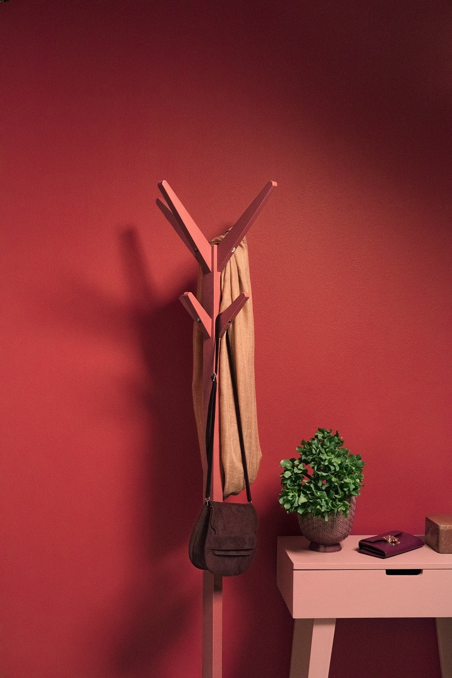 Czasem nawet prosty wieszak potrafi zamienić się w modny dodatek, jeśli zdecydujemy się przemalować go na intensywny i pobudzający kolor. Bordowy odcień Red Deluxe będzie wnętrzarskim strzałem w dziesiątkę dla osób lubiących oryginalne i przyciągające uwagę rozwiązania. Designerska dekoracja będzie wyglądała wyjątkowo ciekawie na tle ścian utrzymanych w podobnej kolorystyce oraz w towarzystwie szafki w odcieniu pudrowego różu. Soczysta zieleń rośliny doniczkowej posłuży natomiast jako barwny kontrapunkt, z powodzeniem dopełniając powstałą aranżację.