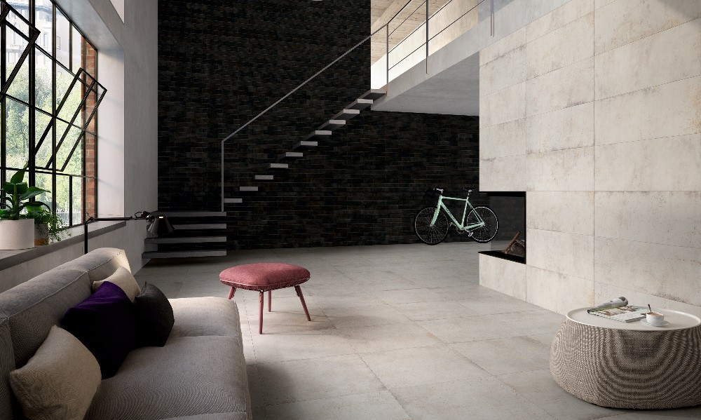 Duże przestrzenie pomagają wydobyć z designu płytek Double Impact wszystkie niuanse. Subtelną siateczkę szarych cieni, połysk oraz granice pomiędzy poszczególnymi partiami projektu. Dodatkowemu uwypukleniu łączeń służyć mogą też listwy lub pojedynczy pas białej mini-mozaiki.