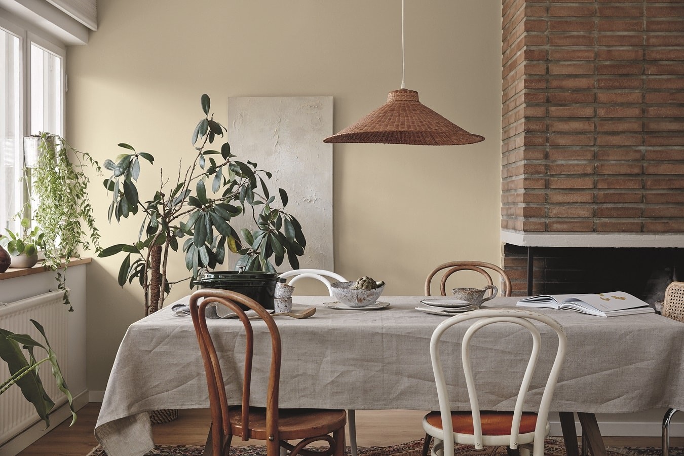 Wystrój w stylu Bohemian doskonale sprawdzi się także w jadalni. Ściany w piaskowym odcieniu X459 w zestawieniu z cegłą oraz bujną roślinnością stworzą bezpretensjonalną aurę sprzyjającą wspólnym posiłkom. Aranżację warto uzupełnić o wybrane akcenty kolorystyczne oraz detale wykonane z drewna czy rattanu.