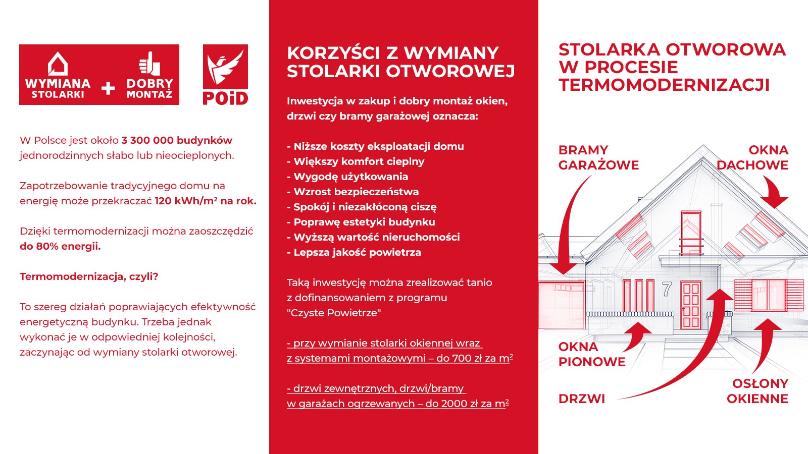 Nasze domy są coraz bardziej nowoczesne i funkcjonalne, ale wciąż zbyt małą uwagę przykładamy do efektywności energetycznej przy ich modernizacji. A to ona powinna być punktem wyjścia przy realizacji tego typu inwestycji. Przedsięwzięcie będzie opłacalne i wpłynie pozytywnie na stan naszego portfela oraz środowiska naturalnego, jeśli poszczególne etapy zrealizujemy w odpowiedniej kolejności. – Duży nacisk kładzie się obecnie na zastępowanie nieefektywnych źródeł ciepła w domach jednorodzinnych, tymi nowoczesnymi. Ta aktywność sama w sobie nie przyniesie oczekiwanych korzyści w przypadku, gdy pominięte zostaną kluczowe działania termomodernizacyjne. W pierwszej kolejności trzeba zabezpieczyć przegrody zewnętrzne, przez które ucieka ciepło, a więc wymienić stare okna, drzwi czy bramę garażową na energooszczędne wyroby, dobrze je zamontować, a następnie wykonać izolację termiczną ścian zewnętrznych. Tylko wówczas wymiana kotła ma sens – tłumaczy Paweł Wróblewski, Dyrektor Zarządzający Związku POiD. – Chcemy uświadamiać odbiorcom, jak powinien wyglądać ten proces. Dlatego ruszamy z programem społecznym „WYMIANA STOLARKI + DOBRY MONTAŻ”, w którym będziemy prezentować benefity zastosowania rozwiązań z naszej branży i przypominać, że warto zadbać o dobry montaż, który jest równie ważny jak dobry produkt – dodaje.