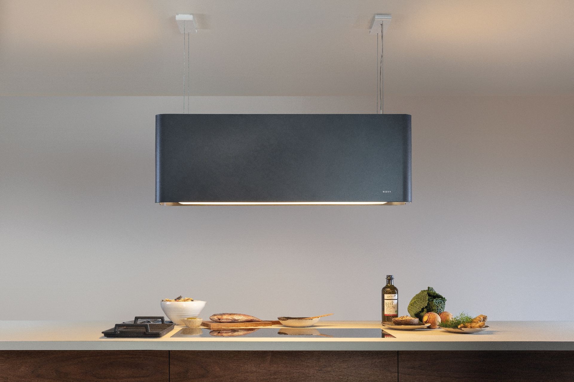 Mood jest bardzo prosty do zamontowania, a regulację wysokości umożliwia poręczny system zawieszenia, nie wymagający wycinania otworów w suficie. Do prawidłowej pracy wystarcza mu źródło energii elektrycznej. Należy jedynie dopilnować, by sufit miał odpowiednią nośność. Brak wylotu powietrza oznacza także większą swobodę przy projektowaniu kuchni. System zawieszenia okapu jest niemal niewidoczny i nie ogranicza poczucia przestrzeni, zamieniając kuchnię w miejsce wypełnione nastrojowym oświetleniem, inspirujące do prezentowania swoich popisów kulinarnych.