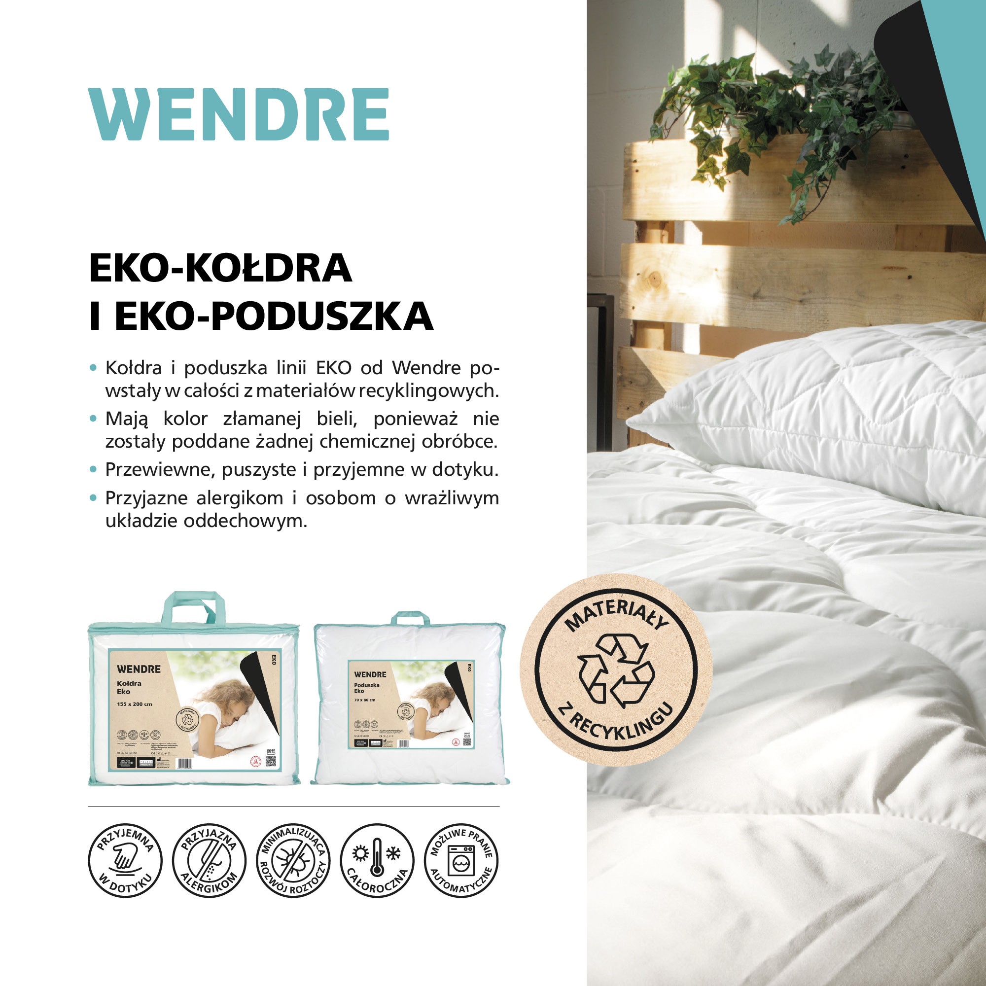 Tekstylia sypialniane też mogą być ekologiczne. Takie rozwiązanie proponuje marka Wendre w nowej linii kołder i poduszek EKO, które w całości wykonane są z materiałów recyklingowych. Tkaniny, z których zostały wyprodukowane mają kolor złamanej bieli, ponieważ w procesie produkcji nie zostały poddane żadnej chemicznej obróbce. Pikowana poduszka EKO dobrze dostosowuje się do naturalnego ułożenia głowy i szyi podczas snu,