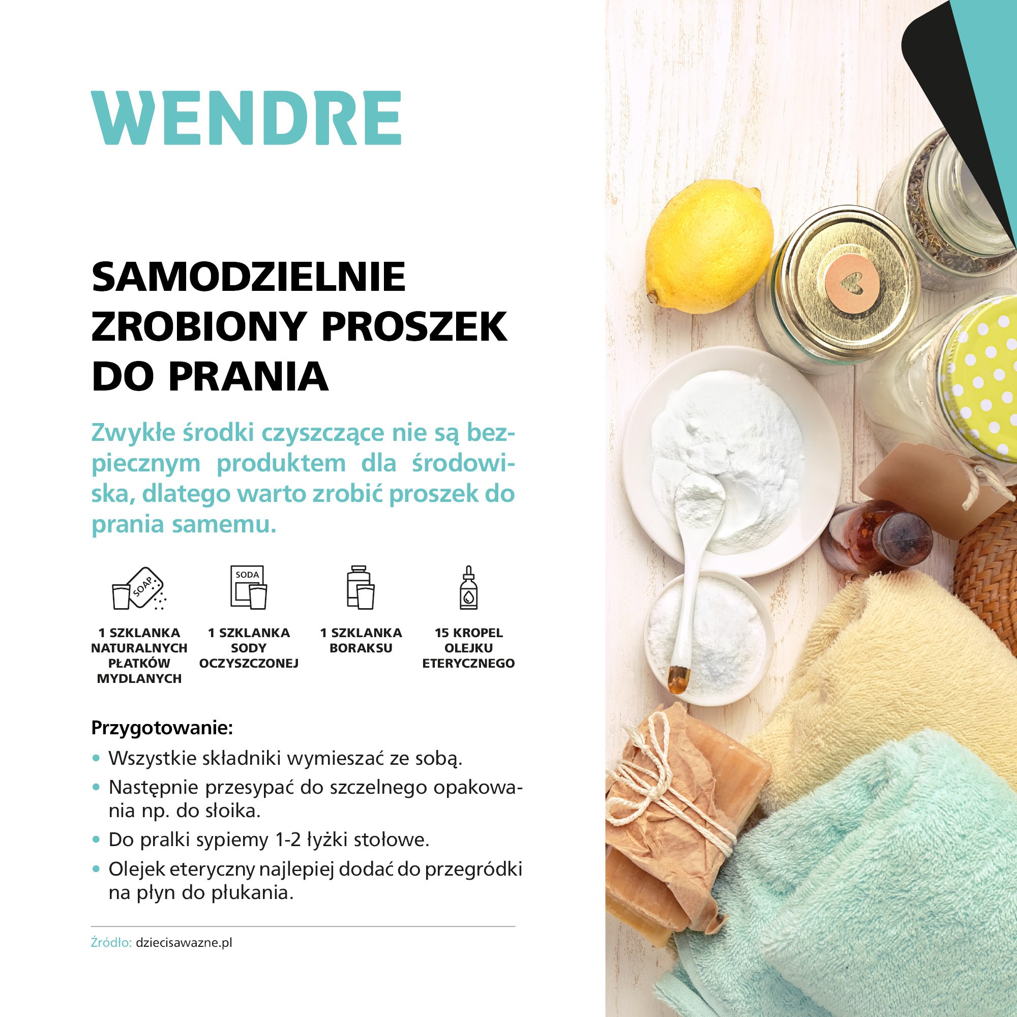Sklepowy proszek do prania też możemy zamienić na samodzielnie przygotowany eko preparat. W internecie można znaleźć wiele sprawdzonych przepisów na domowy proszek. By go wykonać wystarczy kilka składników dostępnych w sklepach ekologicznych, godzina poświęconego czasu i chęć przyjęcia rozwiązań przyjaznych środowisku.