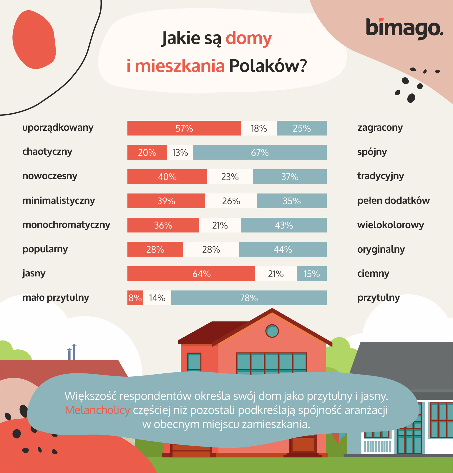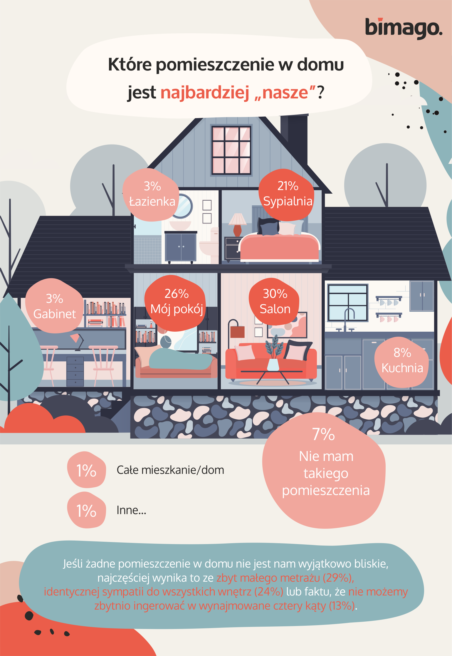 Dane pochodzą z badania przeprowadzonego w kwietniu 2021 roku. Zostało ono wykonane metodą CAWI (ankieta w formie elektronicznej) na próbie 1055 osób. Wszystkie wnioski z uzyskanych odpowiedzi znajdują się w artykule na blogu Bimago: Co mówią o Polakach ich domy? Tak personalizujemy wnętrza