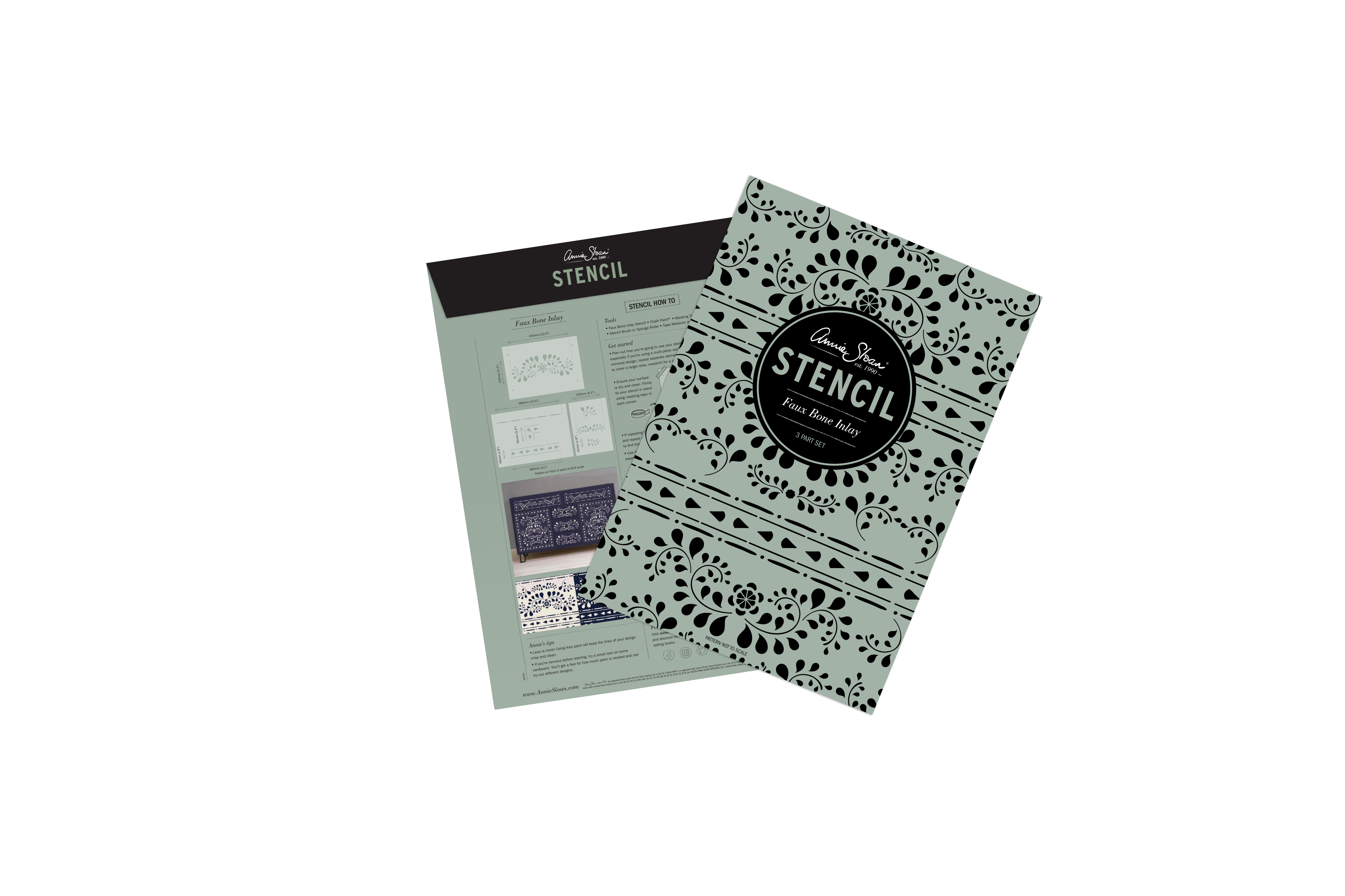 Podczas wyprawy do Radżastanu uwagę artystki zwróciły tradycyjne indyjskie meble inkrustowane kością. Stały się one inspiracją do stworzenia szablonu Faux Bone Inlay. Szablon składa się z trzech oddzielnych elementów, w tym głównego wzoru oraz wyboru obramowań i narożników, które w połączeniu dają projekt w formacie A3. W zestawie znajdują się również elementy mniejszych zdobień, które pozwolą nam spersonalizować wzór.