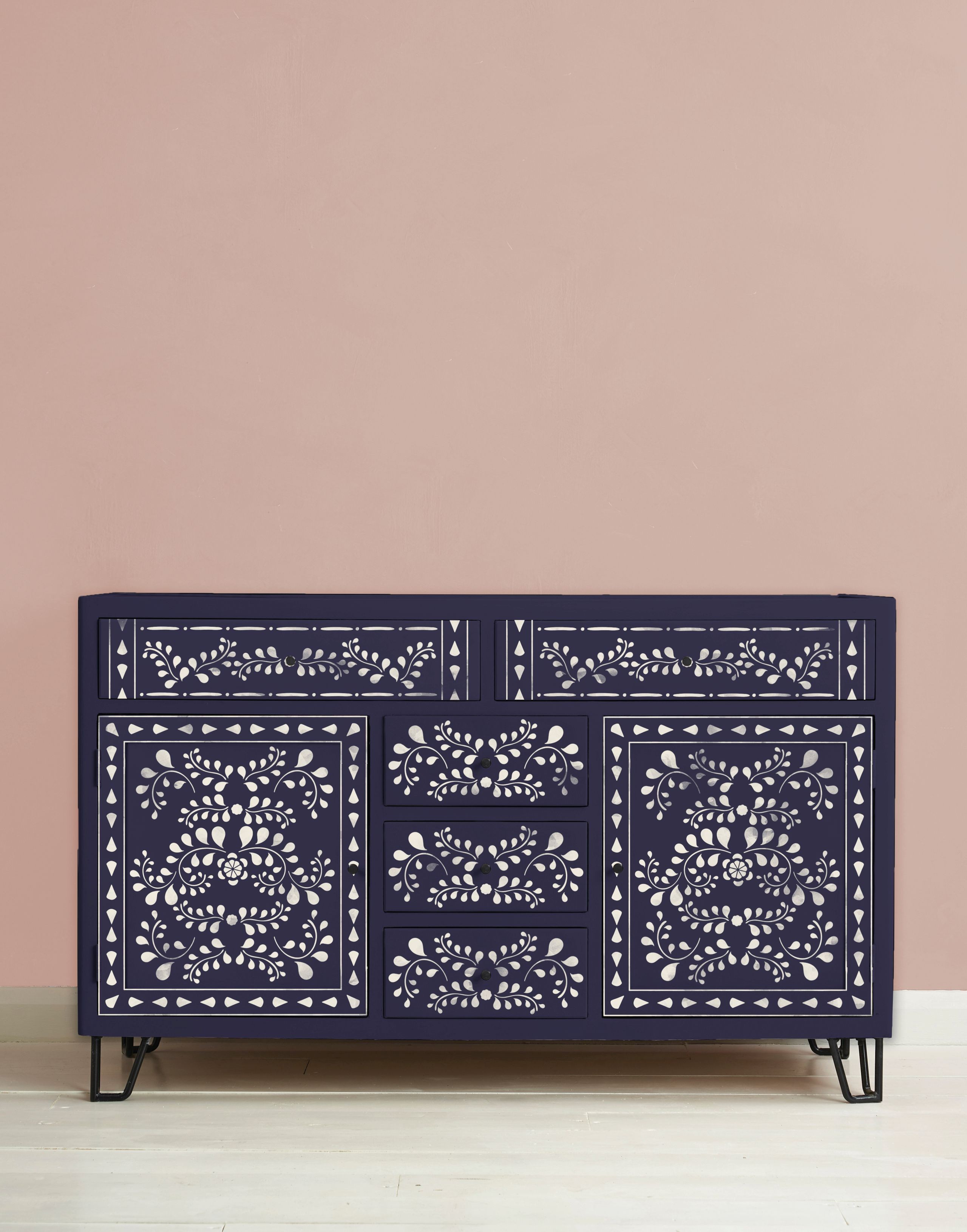 Korzystając z trzyczęściowego szablonu Faux Bone Inlay możemy udekorować orientalnymi wzorami ściany, drzwi, blaty i fronty mebli czy dodatki w domu, ponieważ farba Chalk Paint™ może być z powodzeniem stosowana na większości popularnych materiałów. Dekoratorską fantazję pozwoli nam rozwinąć stworzona przez Annie paleta kolorów farb Chalk Paint™ składająca się z 42 wysmakowanych odcieni.