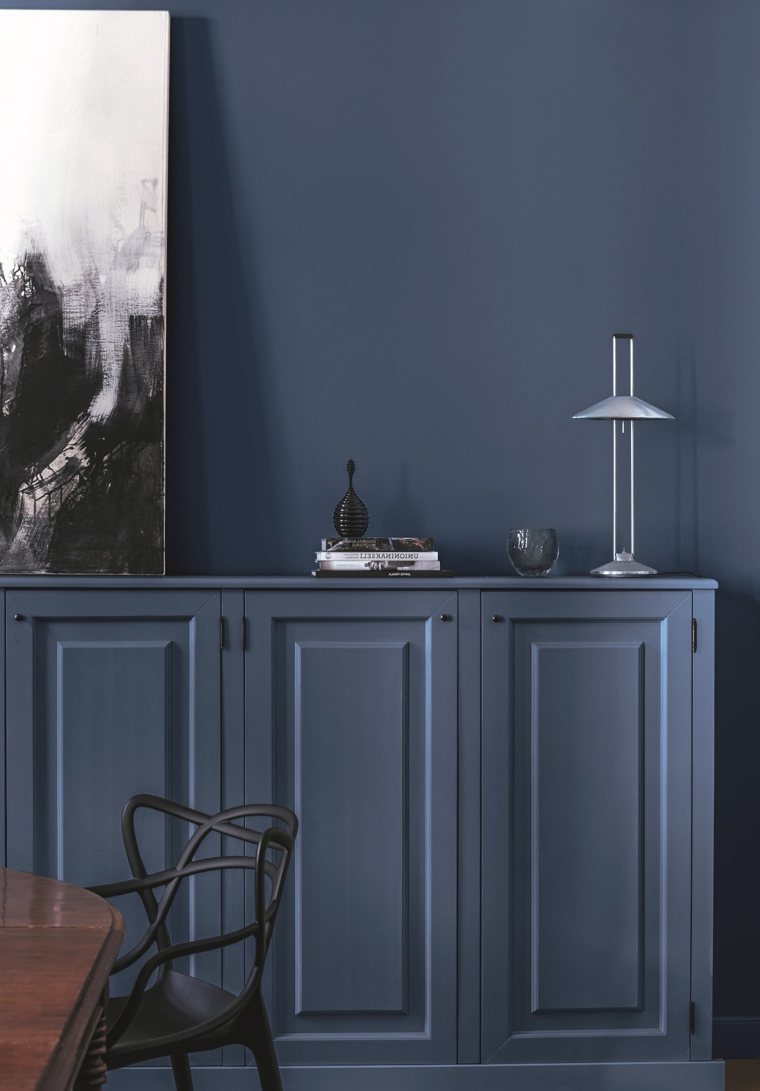 Błękit lubi minimalistyczne połączenia. W wystroju wnętrz doskonale więc radzi sobie w pojedynkę. Monochromatyczne zestawienie kolorów z wykorzystaniem ciemnego granatu L433 Atlantis z palety Tikkurila sprawi, że w salonie zapanuje spokojny, sprzyjający relaksowi klimat. Głęboka tonacja wprowadzi poczucie harmonii do aranżacji, jednocześnie dodając całości szczyptę ekstrawagancji.