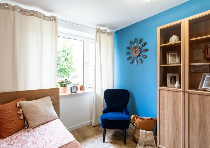 Ostatnie pomieszczenie na parterze Marta zaplanowała dla pani Ani. Zależało jej przede wszystkim na tym, by odnalazła w nim dużo spokoju. Postawiła przy tym na ciepłe kolory ścian oraz jasne meble.