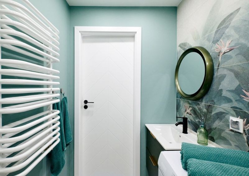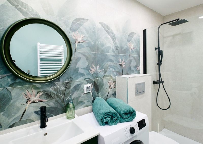 Na wprost wejścia powstał mały korytarz, z którego przechodzi się do nowej łazienki i to ona przeszła największą metamorfozę. Na jej ścianach pojawiły się motywy roślinne, dzięki którym relaks będzie przyjemniejszy. By zaoszczędzić miejsce, w centralnym miejscu wstawiono prysznic.