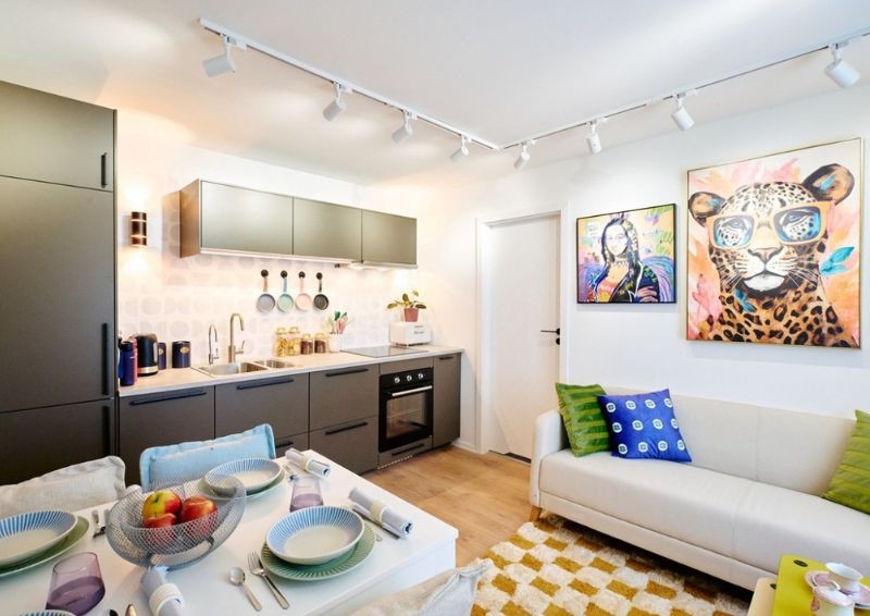 Dzięki przesunięciu ściany, powstał pokój dzienny połączony z kuchnią i jadalnią. Wygodna sofa oraz telewizor sprawiły, że stanie się miejscem do wspólnego wypoczynku. Martyna wybrała biały kolor ścian, a odrobiny szaleństwa dodała za pośrednictwem kolorowych obrazów. Kontrastu nadały także ciemne meble kuchenne.
