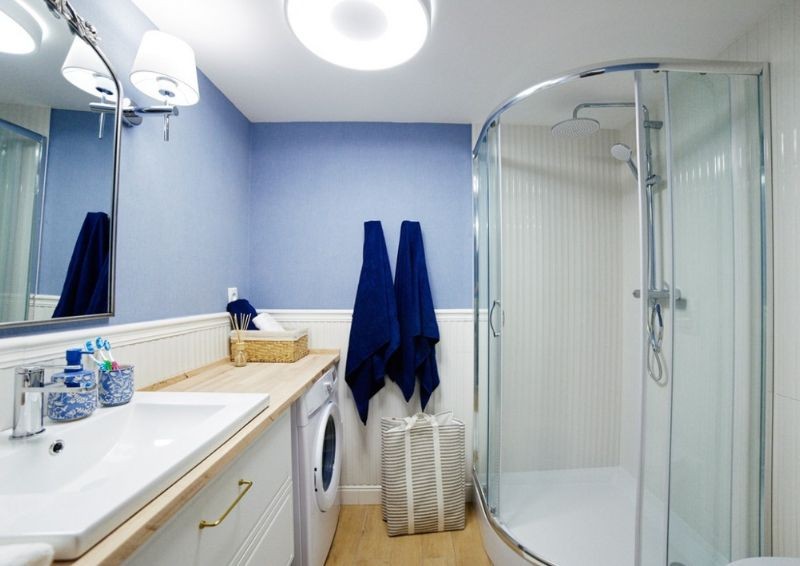 Biało-błękitne barwy stały się także motywem przewodnim w nowo powstałej łazience. Wybrano do środka bardzo duży prysznic i dużą szafkę pod umywalkę, której blat przykrywa pralkę. Całość świetnie współgra z resztą domu.