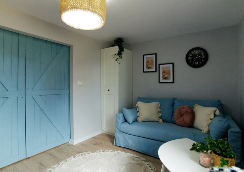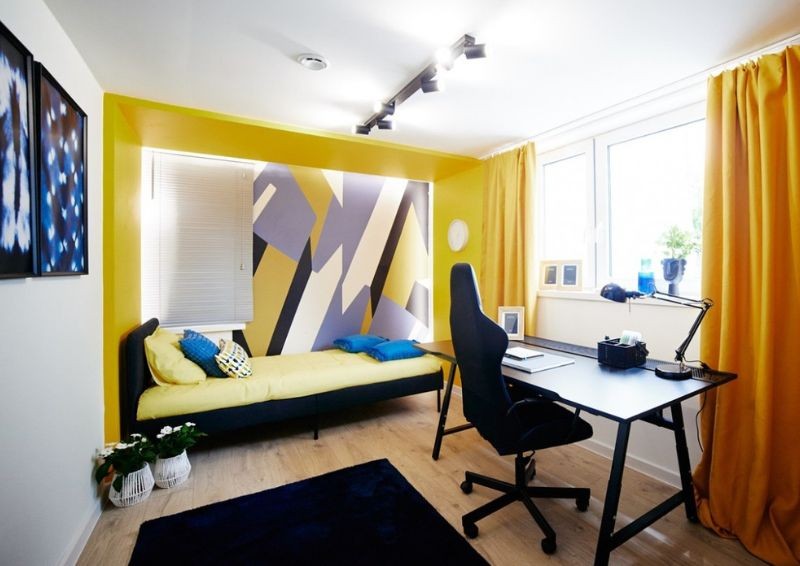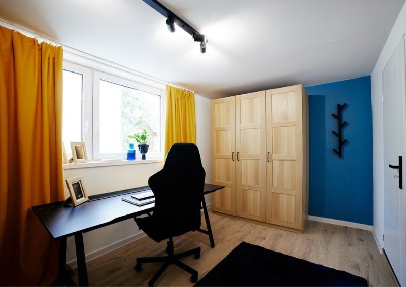 Maciej Pertkiewicz podszedł do projektu w taki sposób, by każdy z mieszkańców miał swój własny kąt. Dzięki temu udało się wyodrębnić przestrzeń na kilka pokoi. Pierwszy z nich stał się eleganckim miejscem, w którym wykorzystano kilka kolorów do ubarwienia ścian i w ten sposób tchnięto w nie nowe życie. W środku wstawiono wygodne, pojedyncze łóżko, duże biurko z wygodnym krzesłem oraz przestronną szafę.