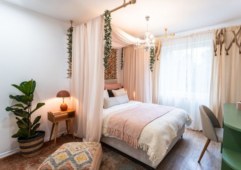 Ostatni pokój wzbogacono w duże, dwuosobowe łóżko w beżowym odcieniu, a całe wnętrze utrzymano w jasnych kolorach. Ważny element kompozycji stanowi roślinność, która zdobi także łóżko. W tym pomieszczeniu nic nie wydaje się być przypadkowe. Znalazło się także miejsce na zielony stolik.