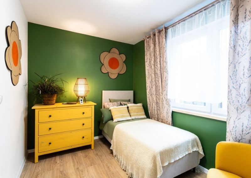 Drugi pokój stanie się oazą spokoju dzięki zestawieniu zielono-białych ścian. W skromnym pomieszczeniu znalazła się również komoda i fotel w wyróżniającym, żółtym kolorze. W tym miejscu będzie można prawdziwie ładować baterie.